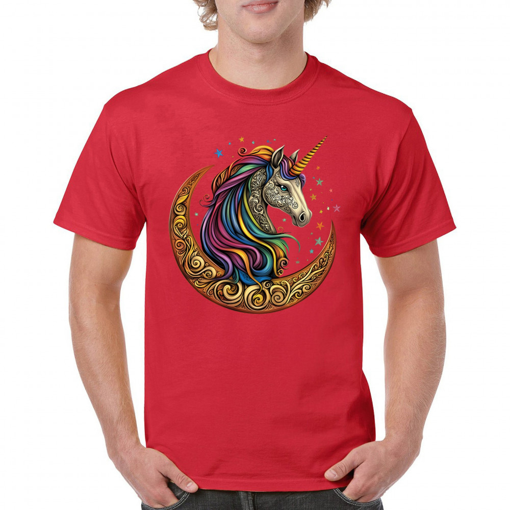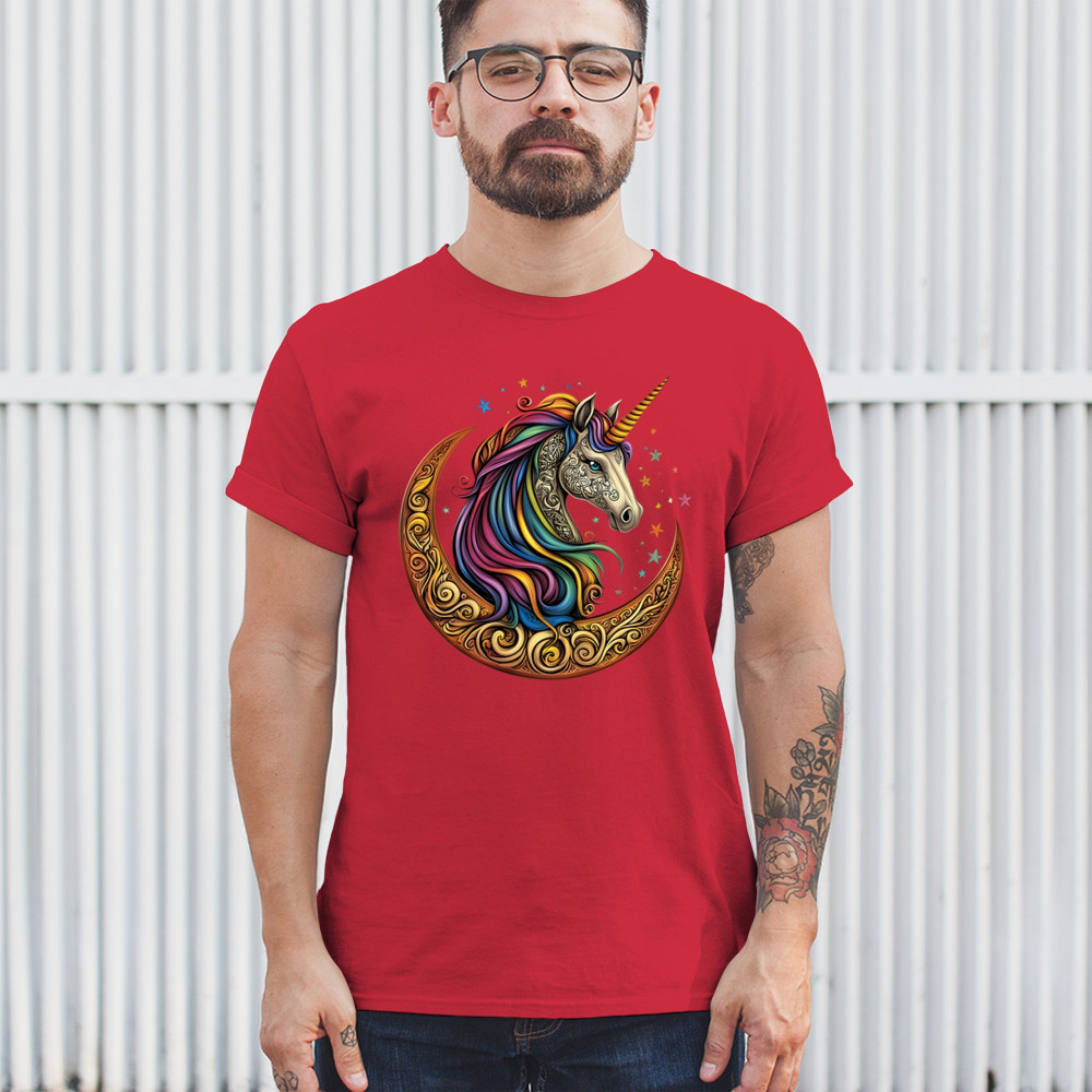 Rainbow-maned unicorn in golden Celtic moon design—perfect for fantasy lovers, dreamers, and unicorn fans who believe in magic and spirit.