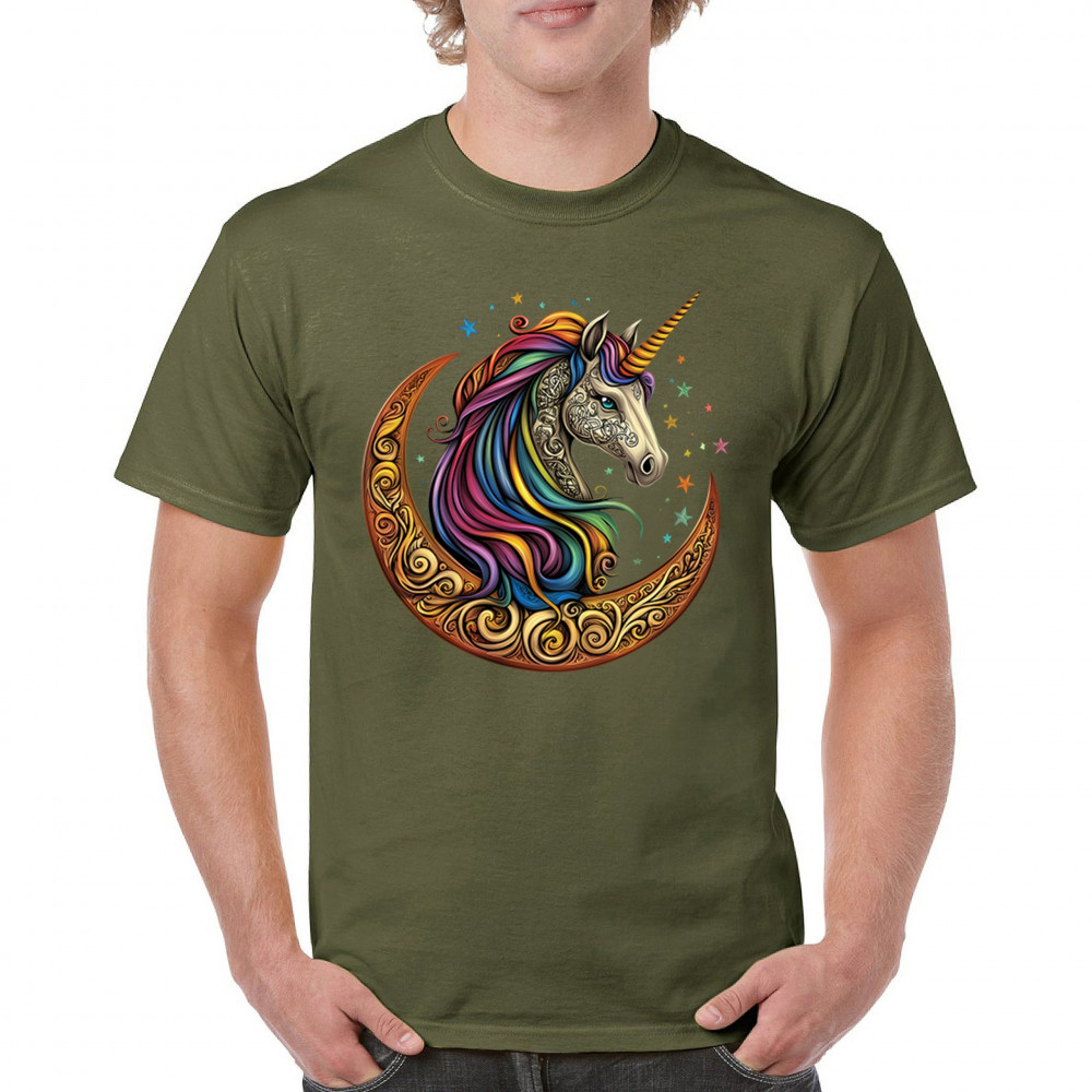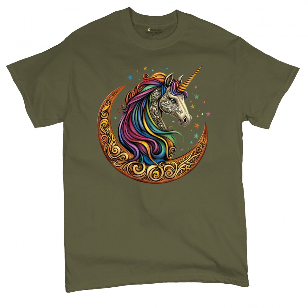 Rainbow-maned unicorn in golden Celtic moon design—perfect for fantasy lovers, dreamers, and unicorn fans who believe in magic and spirit.