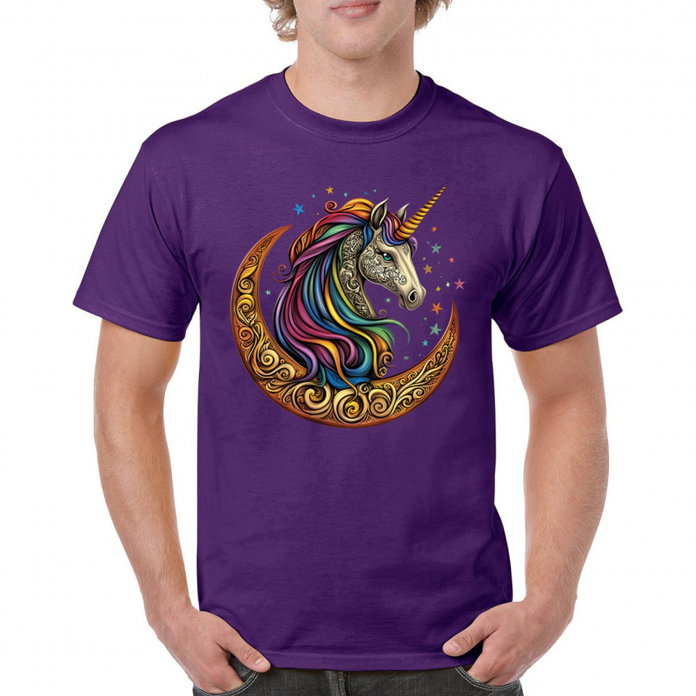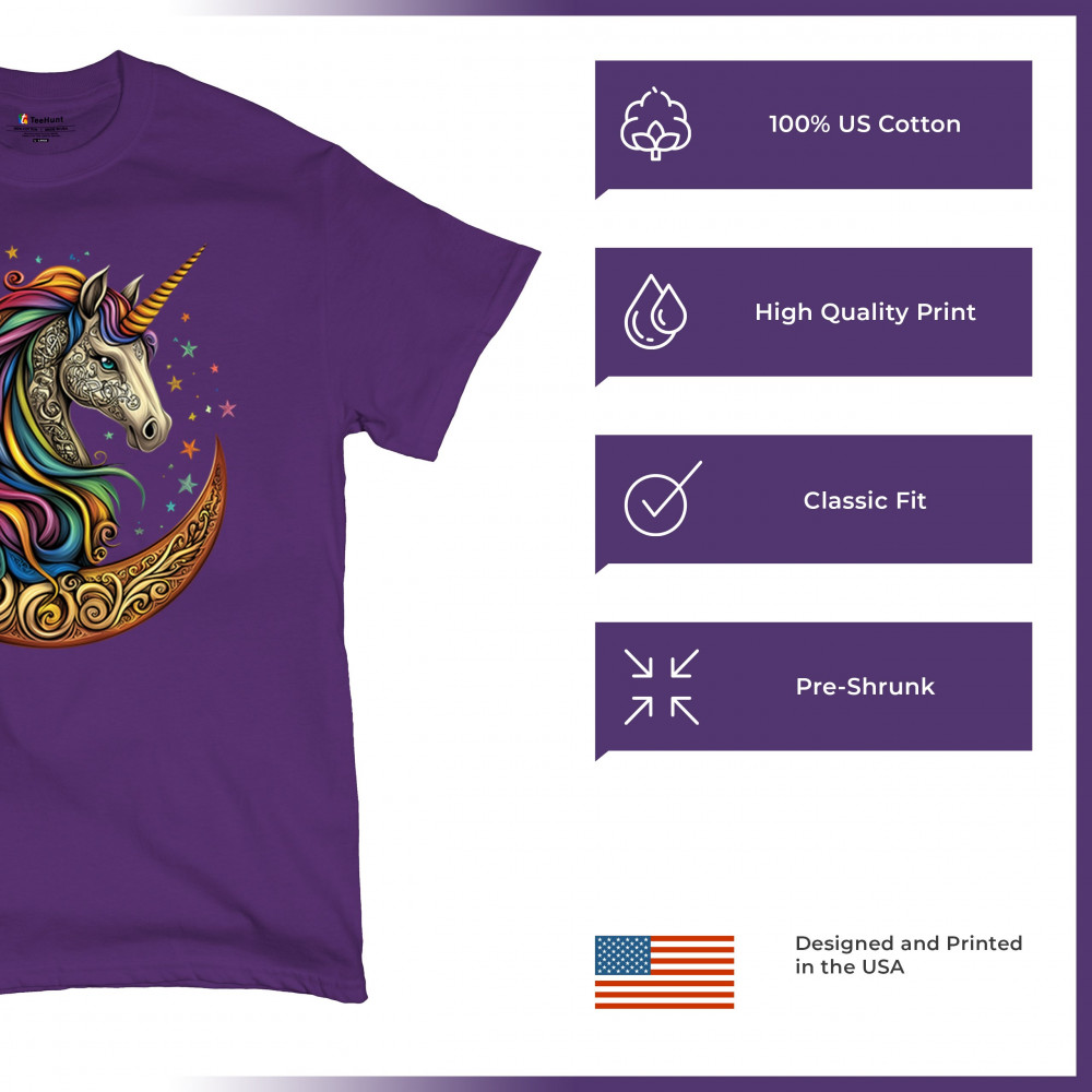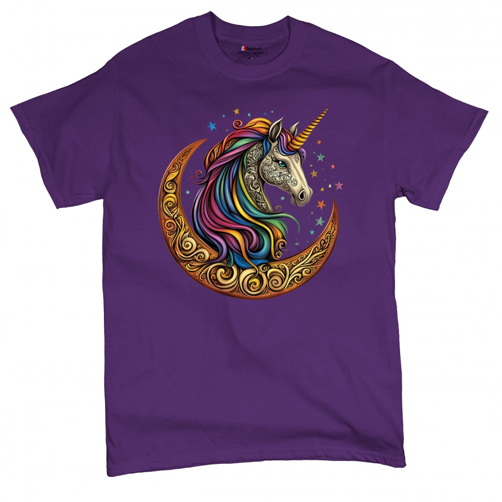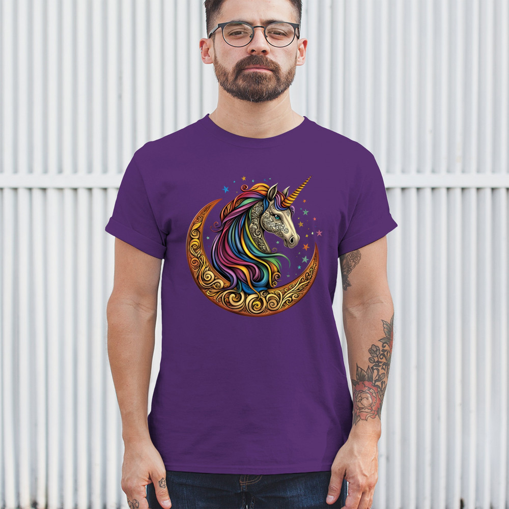 Rainbow-maned unicorn in golden Celtic moon design—perfect for fantasy lovers, dreamers, and unicorn fans who believe in magic and spirit.