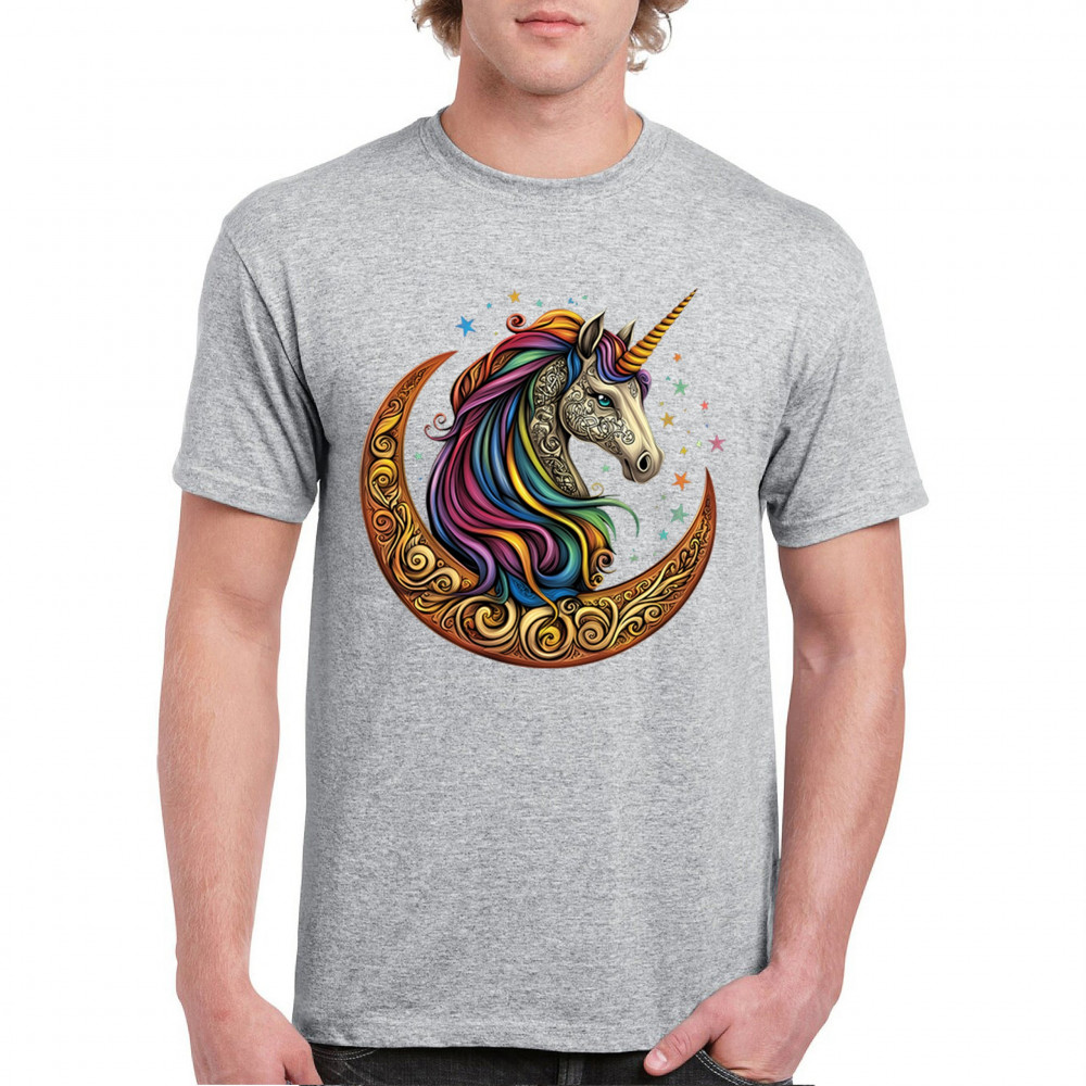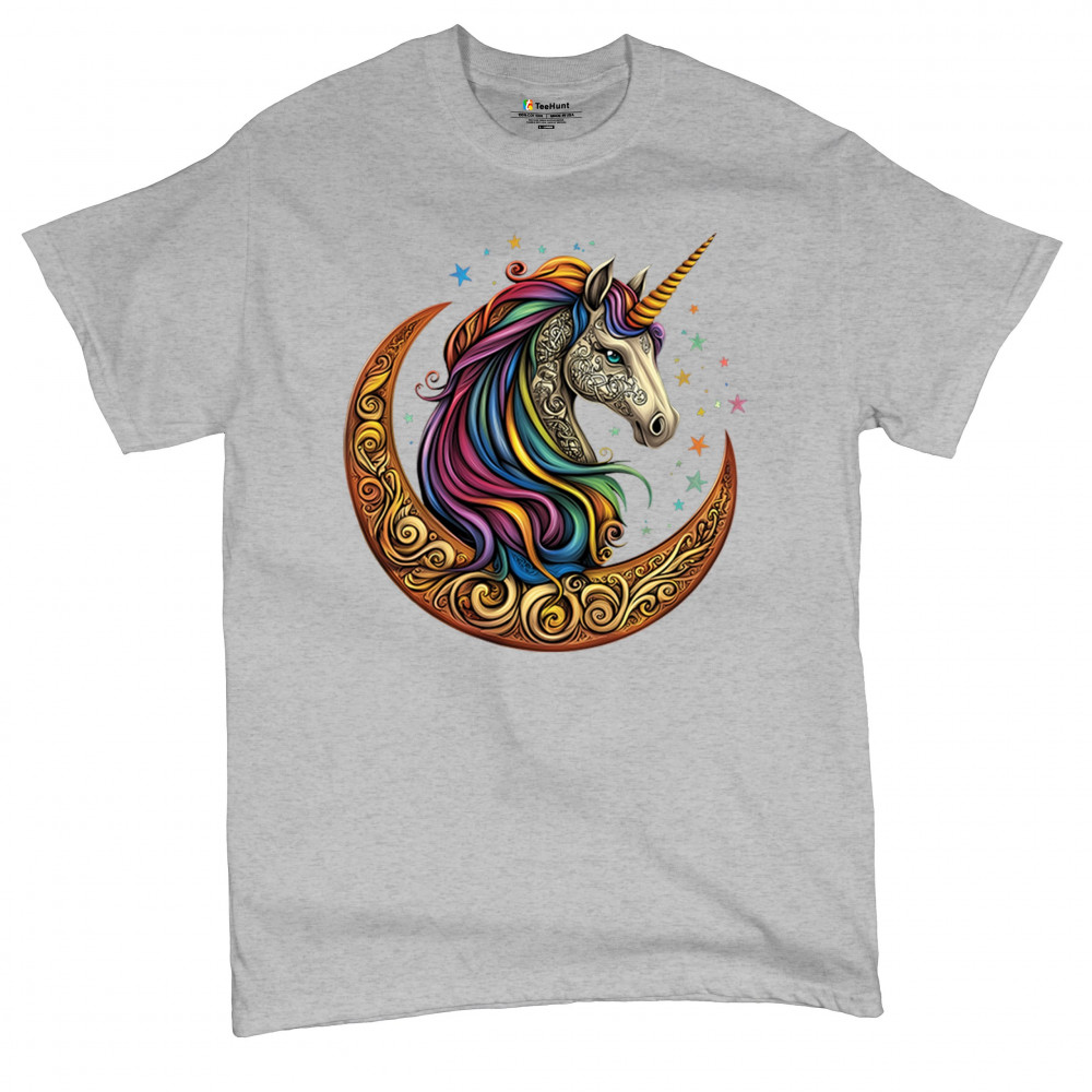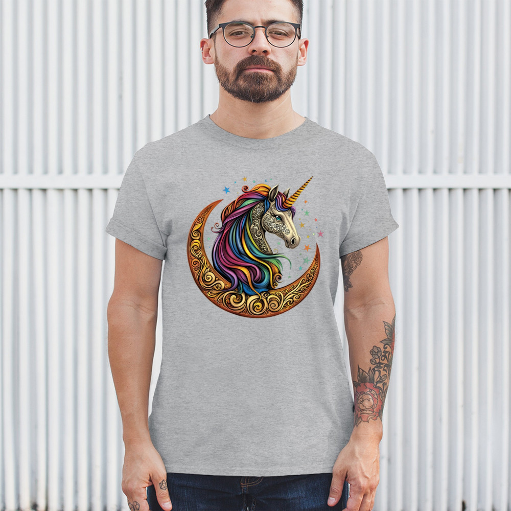 Rainbow-maned unicorn in golden Celtic moon design—perfect for fantasy lovers, dreamers, and unicorn fans who believe in magic and spirit.