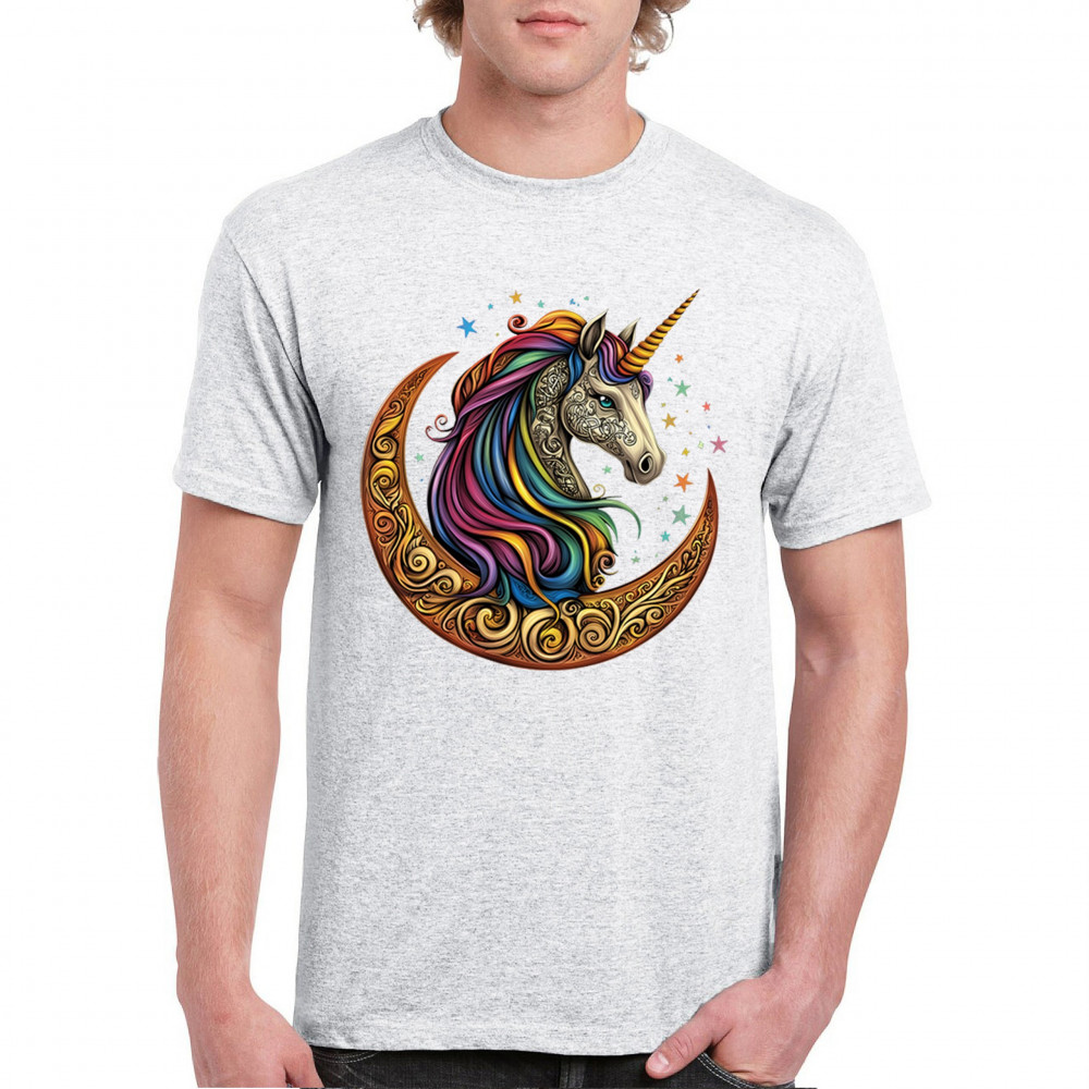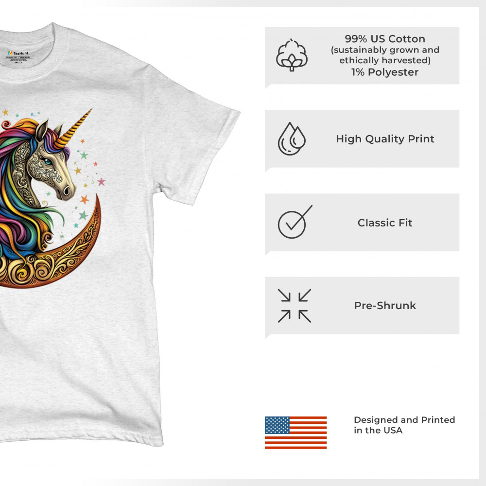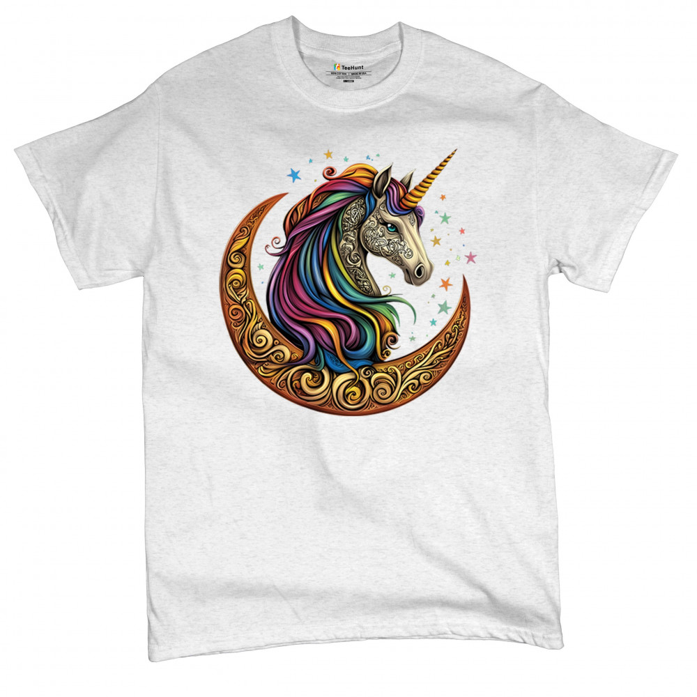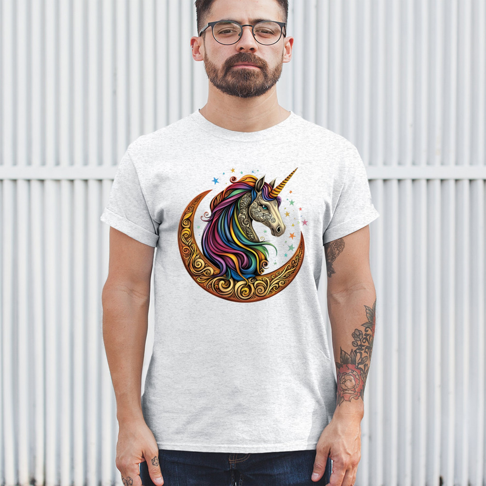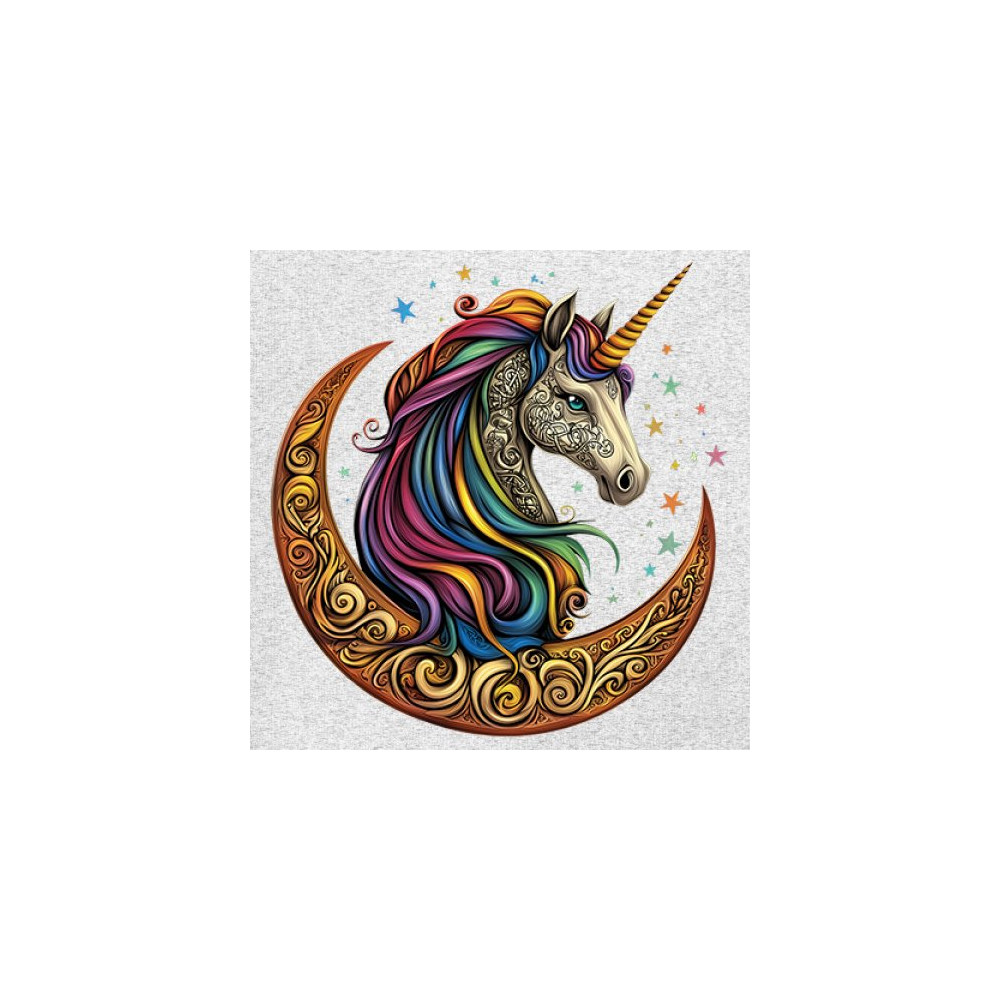 Rainbow-maned unicorn in golden Celtic moon design—perfect for fantasy lovers, dreamers, and unicorn fans who believe in magic and spirit.