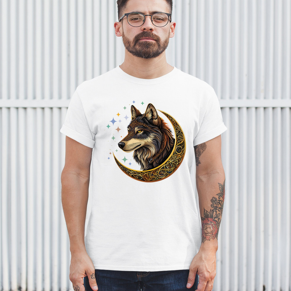 Powerful and wise, this Celtic wolf design is surrounded by a glowing golden crescent moon and cosmic stars. A symbol of loyalty, intuition, and spiritual guidance, this design is perfect for wolf lovers, fantasy fans, and tribal art enthusiasts. A bold celebration of wilderness mysticism and soul-deep strength.