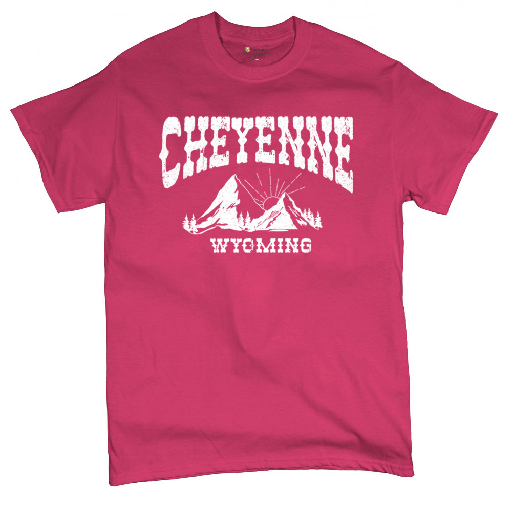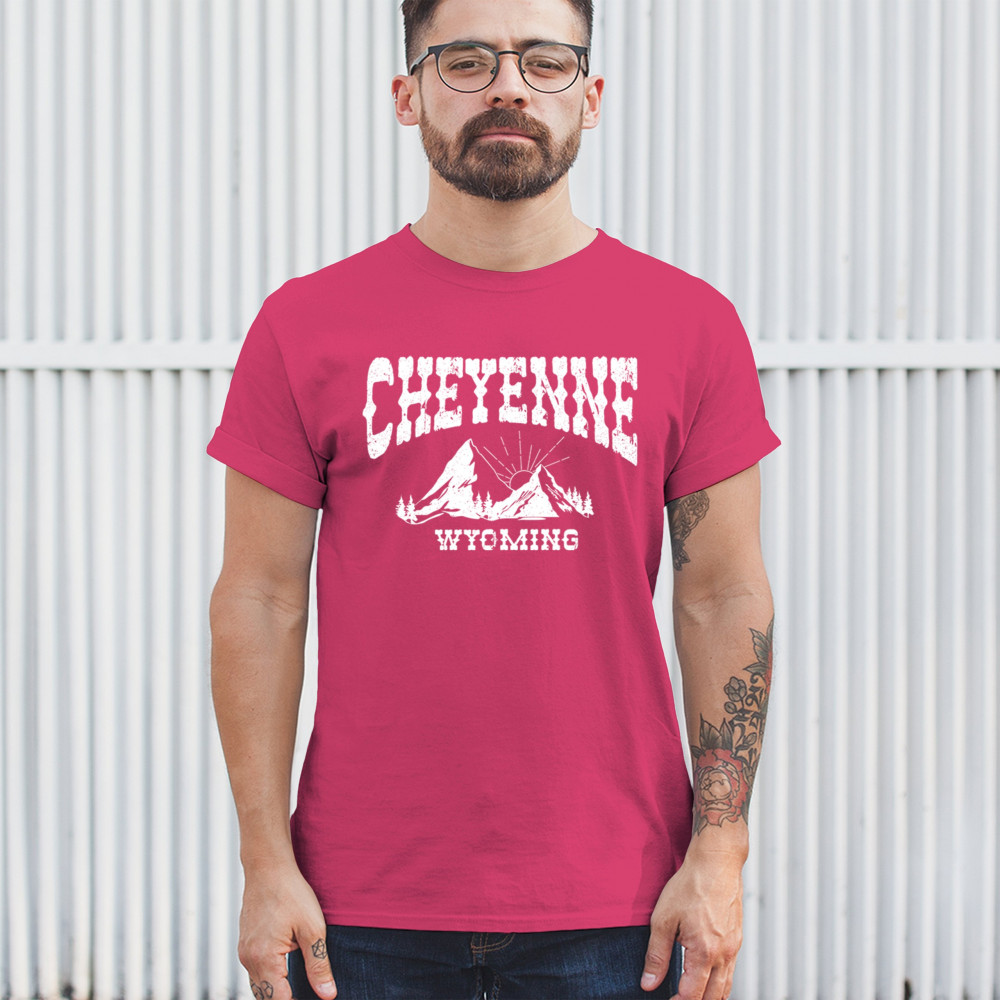 Vintage Cheyenne Wyoming design with mountain sunrise for outdoor lovers and locals. Perfect for travel, hiking, or Western pride.