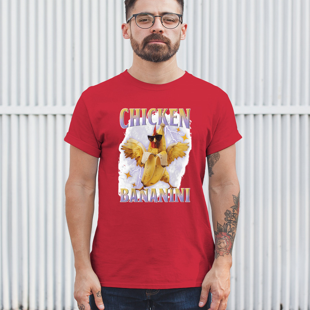 Chicken Bananini is meme absurdity with extra peel. Featuring a chicken emerging from a banana and rocking shades, this design blends cursed-core fashion, viral animal humor, Gen Z brainrot, and TikTok-style chaos. A must-have for fans of ironic mashups, surreal creatures, and internet-fueled nonsense.
