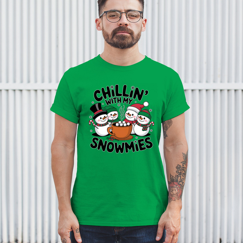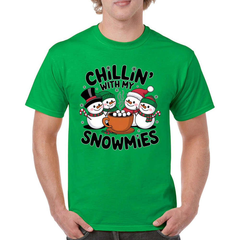 A cute and cheerful winter design showing happy snowmen sharing hot cocoa, perfect for Christmas gatherings, holiday events, seasonal photos, white-elephant gifting, festive family nights, winter celebrations, cozy weekend vibes, and fans of playful holiday humor. A fun graphic for anyone who loves bright and friendly Christmas styles.