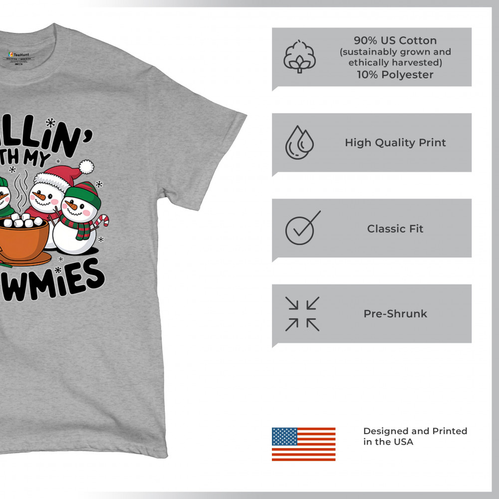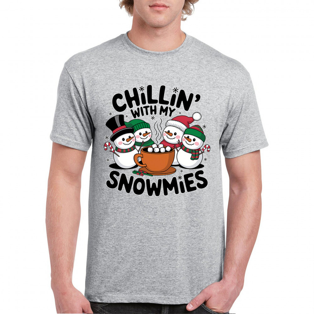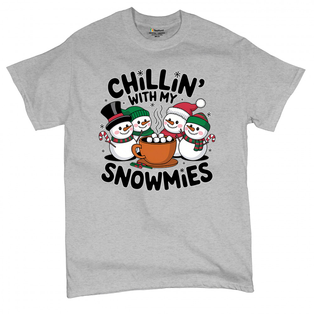 A cute and cheerful winter design showing happy snowmen sharing hot cocoa, perfect for Christmas gatherings, holiday events, seasonal photos, white-elephant gifting, festive family nights, winter celebrations, cozy weekend vibes, and fans of playful holiday humor. A fun graphic for anyone who loves bright and friendly Christmas styles.
