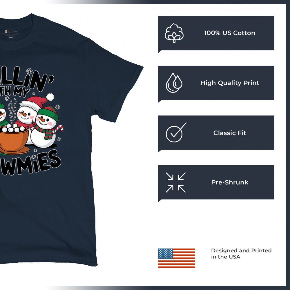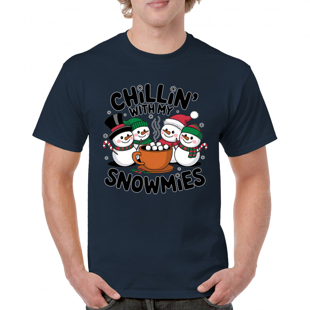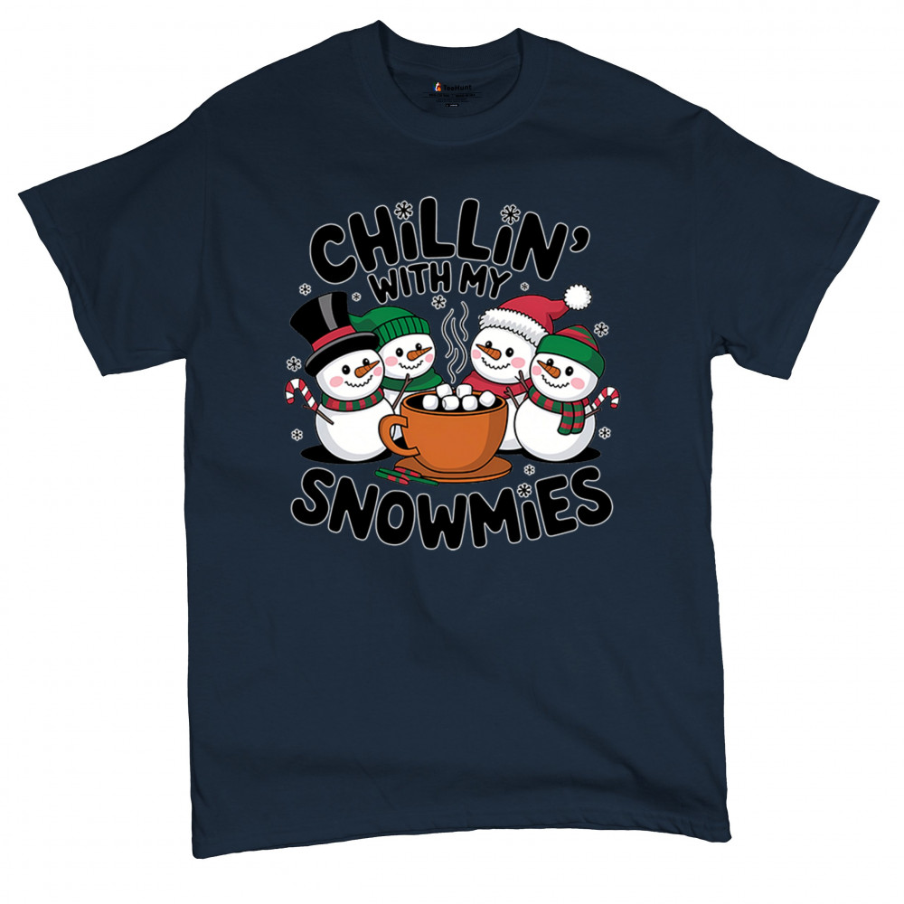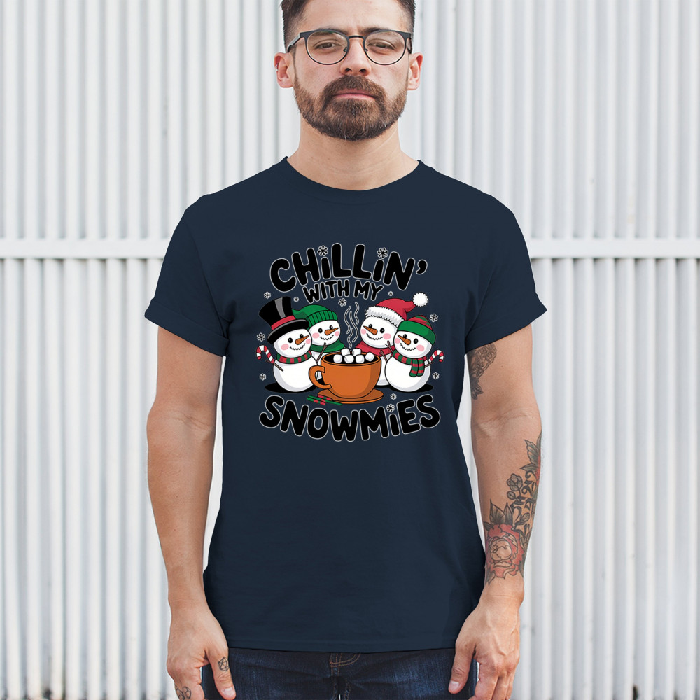 A cute and cheerful winter design showing happy snowmen sharing hot cocoa, perfect for Christmas gatherings, holiday events, seasonal photos, white-elephant gifting, festive family nights, winter celebrations, cozy weekend vibes, and fans of playful holiday humor. A fun graphic for anyone who loves bright and friendly Christmas styles.