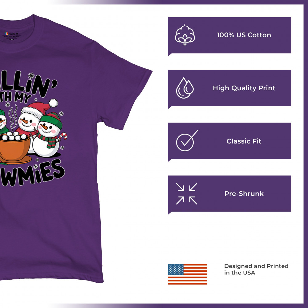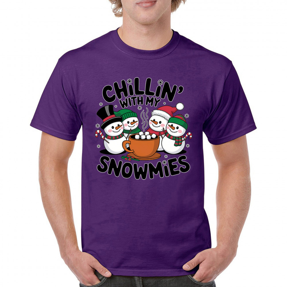 A cute and cheerful winter design showing happy snowmen sharing hot cocoa, perfect for Christmas gatherings, holiday events, seasonal photos, white-elephant gifting, festive family nights, winter celebrations, cozy weekend vibes, and fans of playful holiday humor. A fun graphic for anyone who loves bright and friendly Christmas styles.