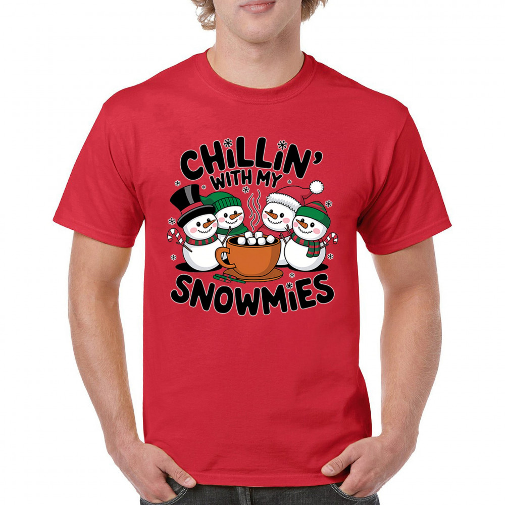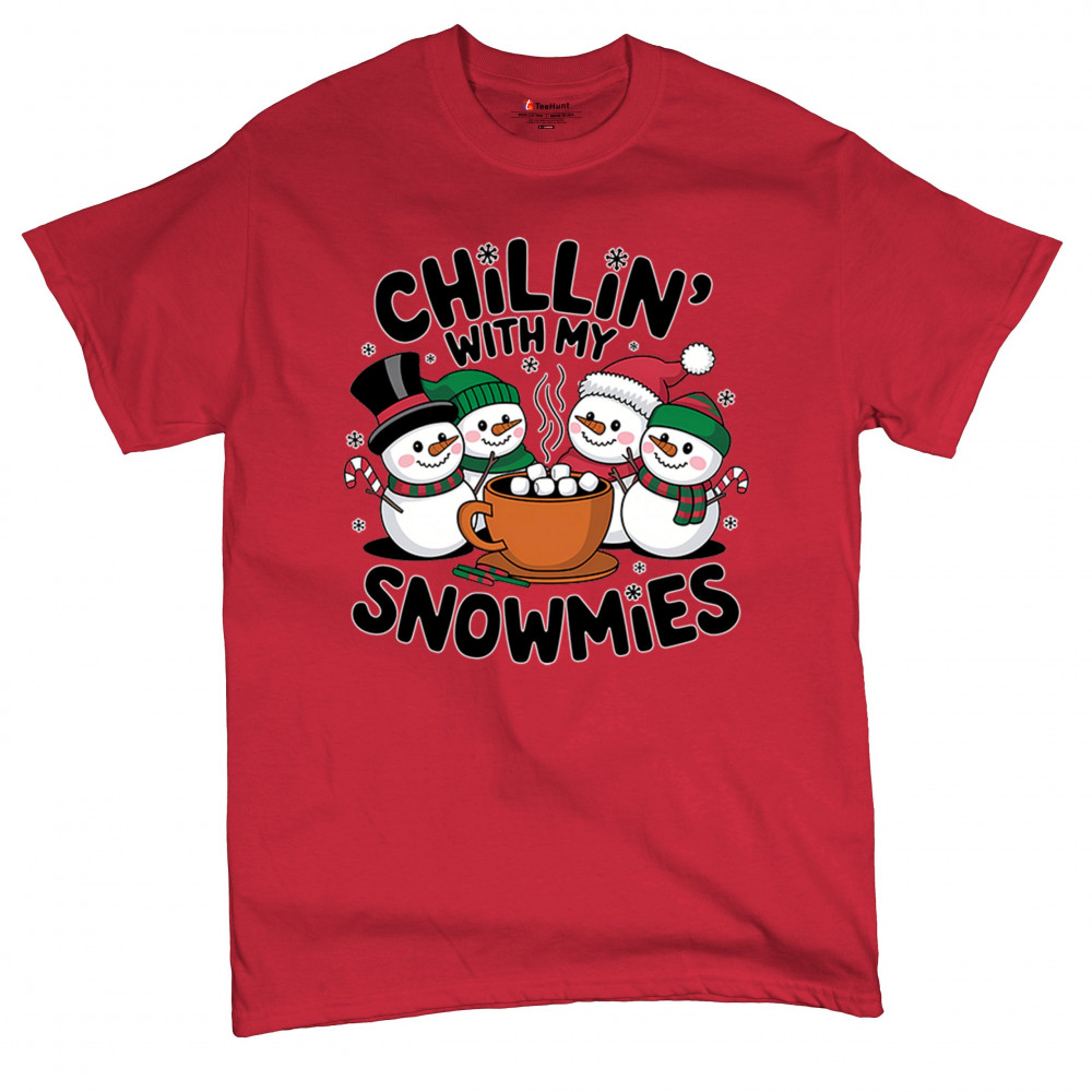 A cute and cheerful winter design showing happy snowmen sharing hot cocoa, perfect for Christmas gatherings, holiday events, seasonal photos, white-elephant gifting, festive family nights, winter celebrations, cozy weekend vibes, and fans of playful holiday humor. A fun graphic for anyone who loves bright and friendly Christmas styles.