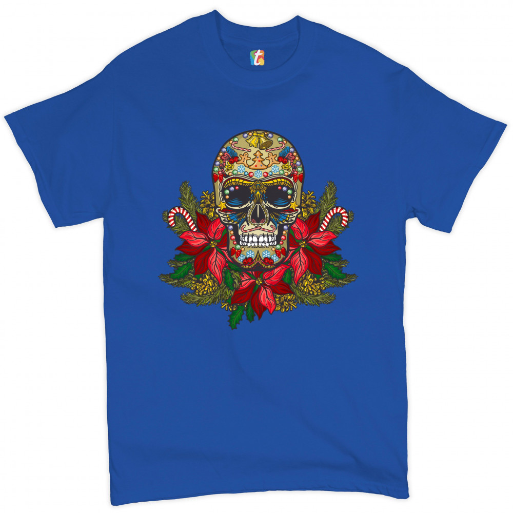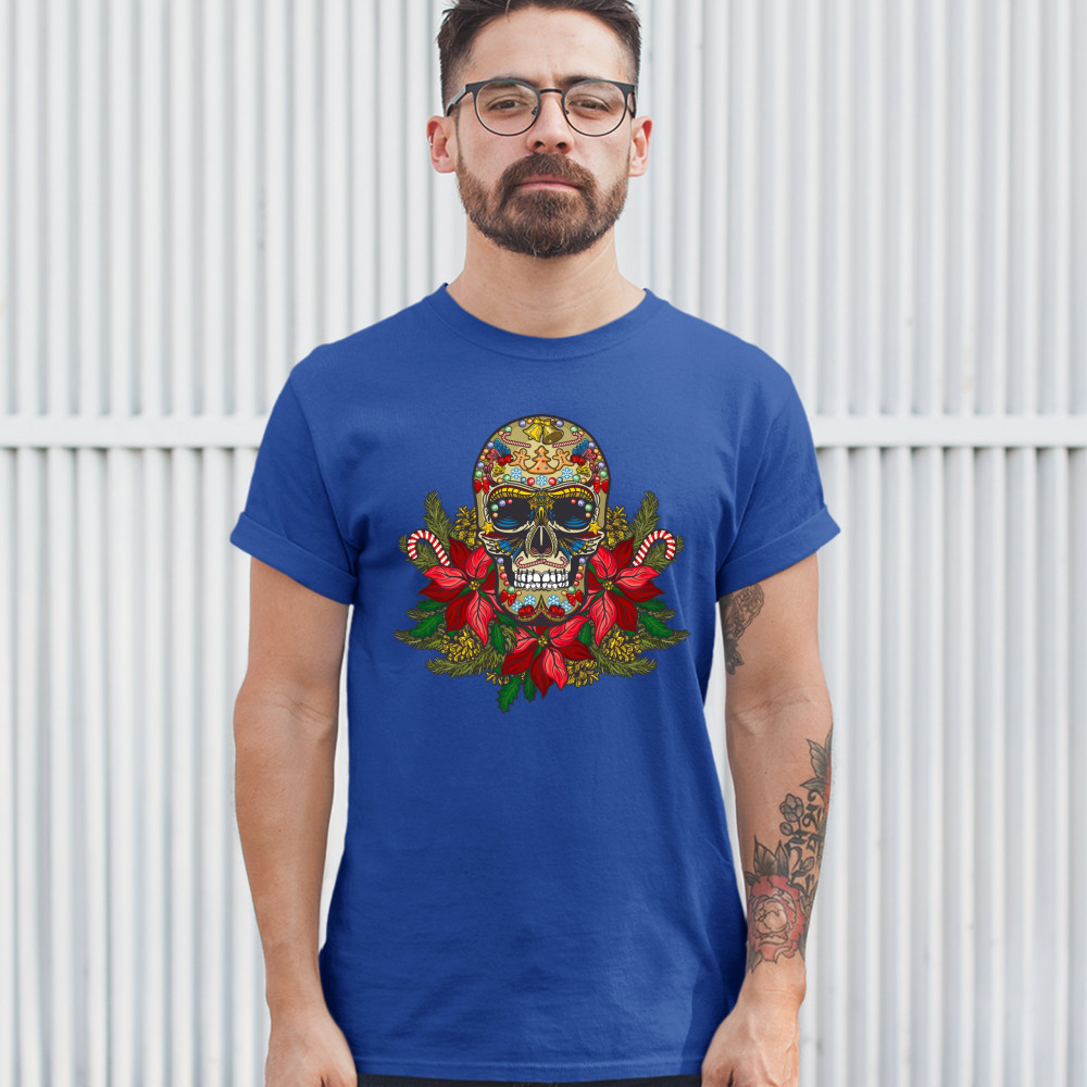A print featuring a gorgeous sugar skull sitting atop of mistletoe. The skull is decorated with bells, candy canes and gingerbread men dancing around a Christmas tree on the forehead. It has candy canes instead of mustaches and wings underneath the eye so