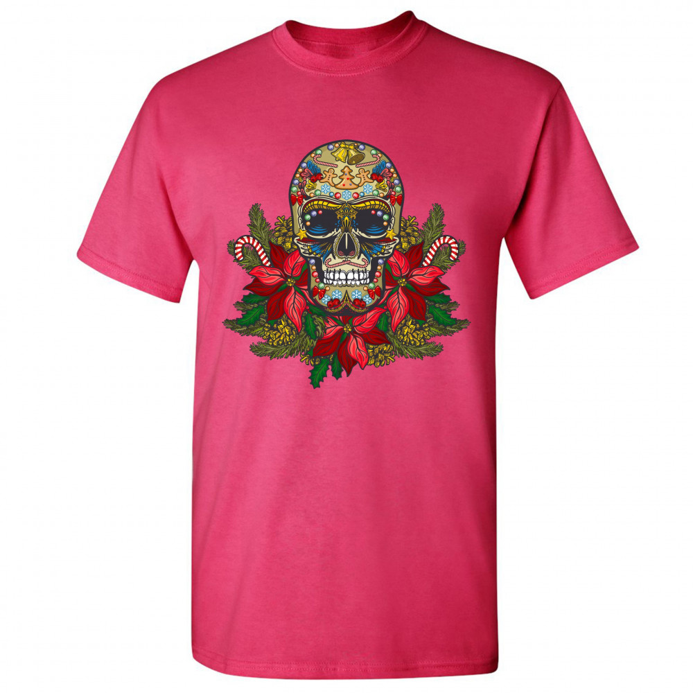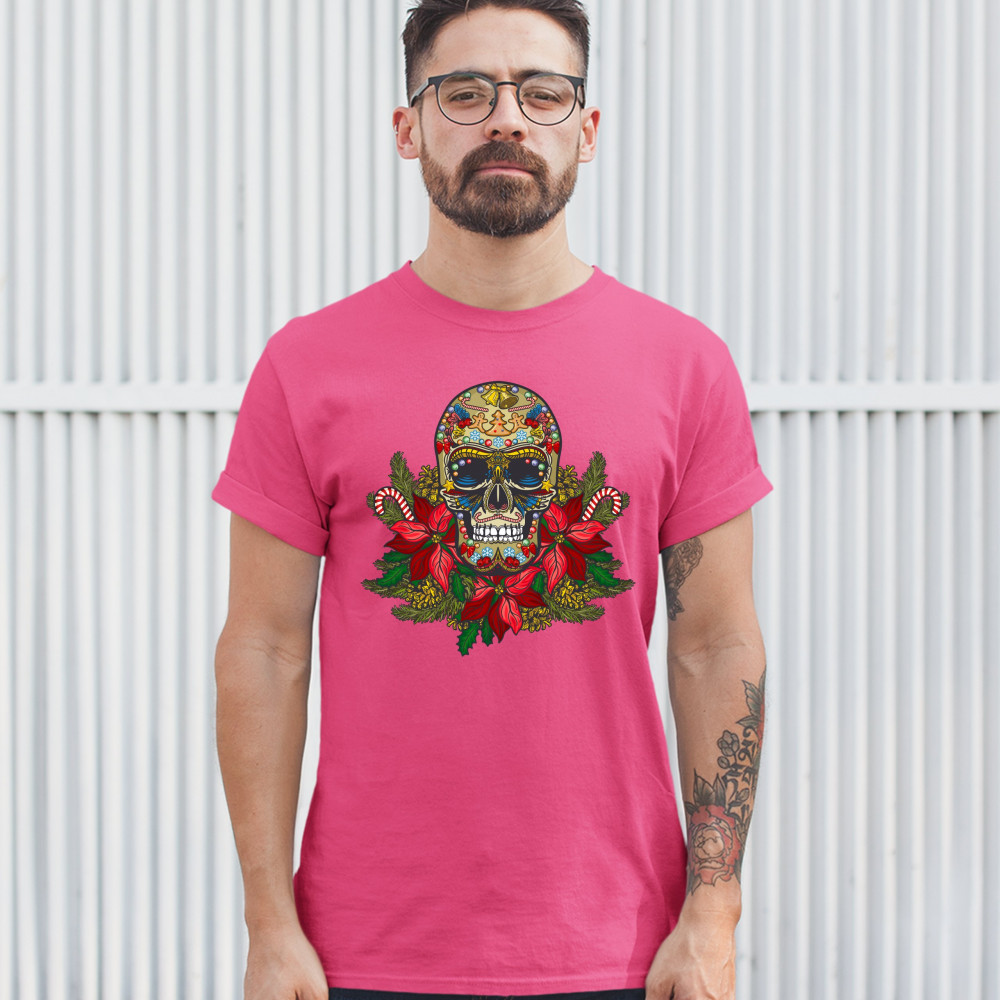 A print featuring a gorgeous sugar skull sitting atop of mistletoe. The skull is decorated with bells, candy canes and gingerbread men dancing around a Christmas tree on the forehead. It has candy canes instead of mustaches and wings underneath the eye so