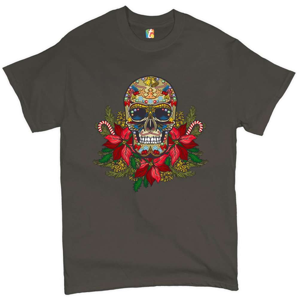 A print featuring a gorgeous sugar skull sitting atop of mistletoe. The skull is decorated with bells, candy canes and gingerbread men dancing around a Christmas tree on the forehead. It has candy canes instead of mustaches and wings underneath the eye so