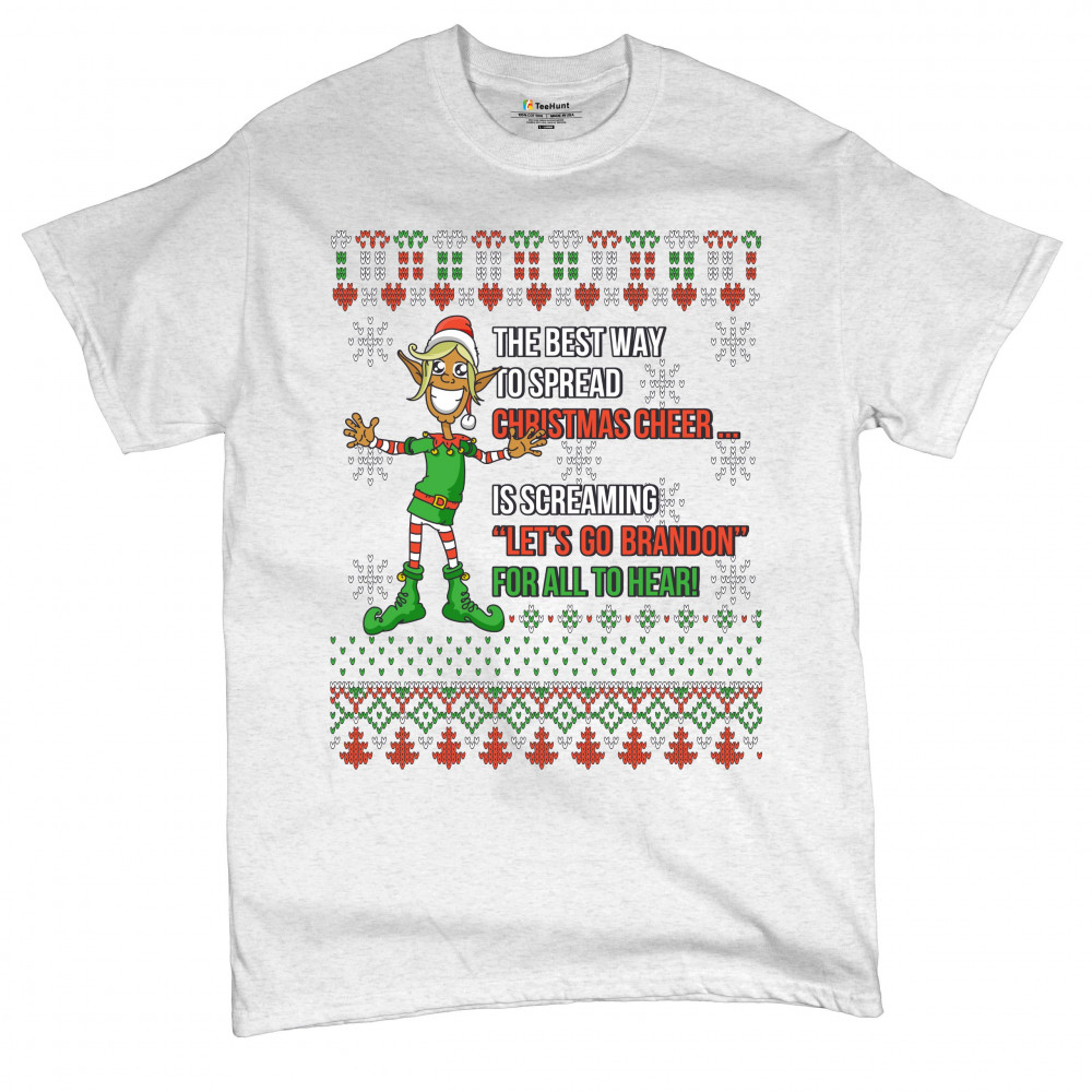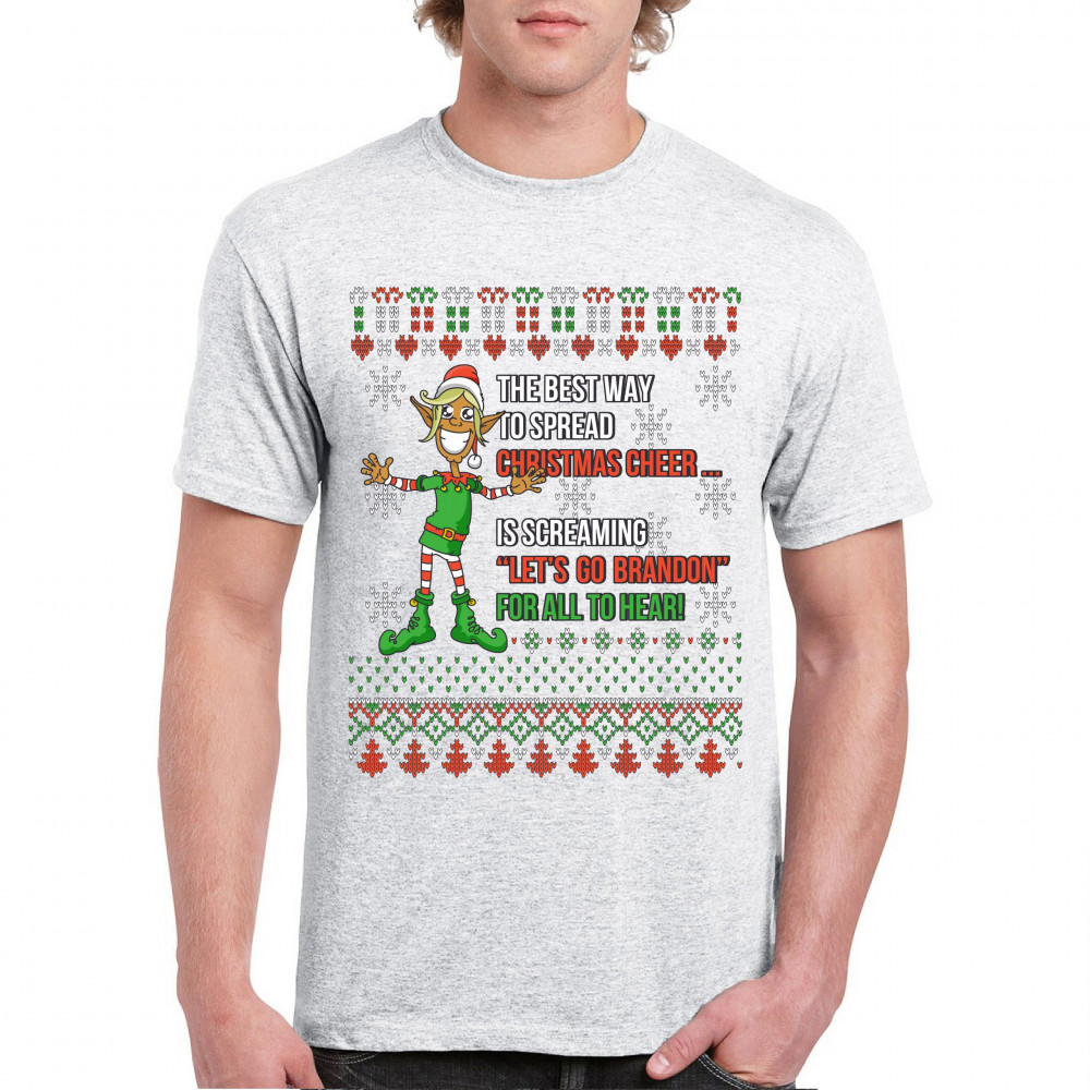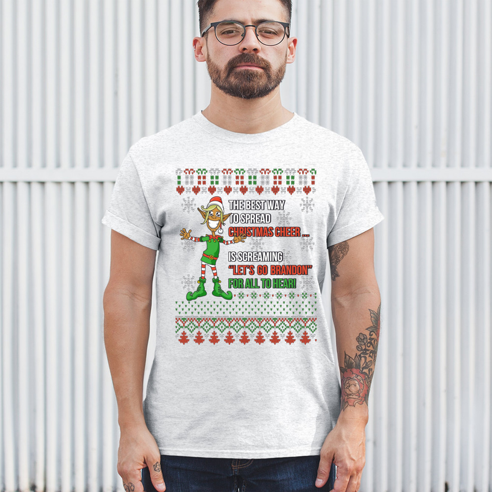 A funny print saying: "The Best Way to Spread Christmas Cheer Is Screaming Let's Go Brandon for All to Hear" and featuring a smiling elf. The print is decorated as a Christmas ugly Sweater. A great choice to wear for a Christmas or New Year's Eve party an