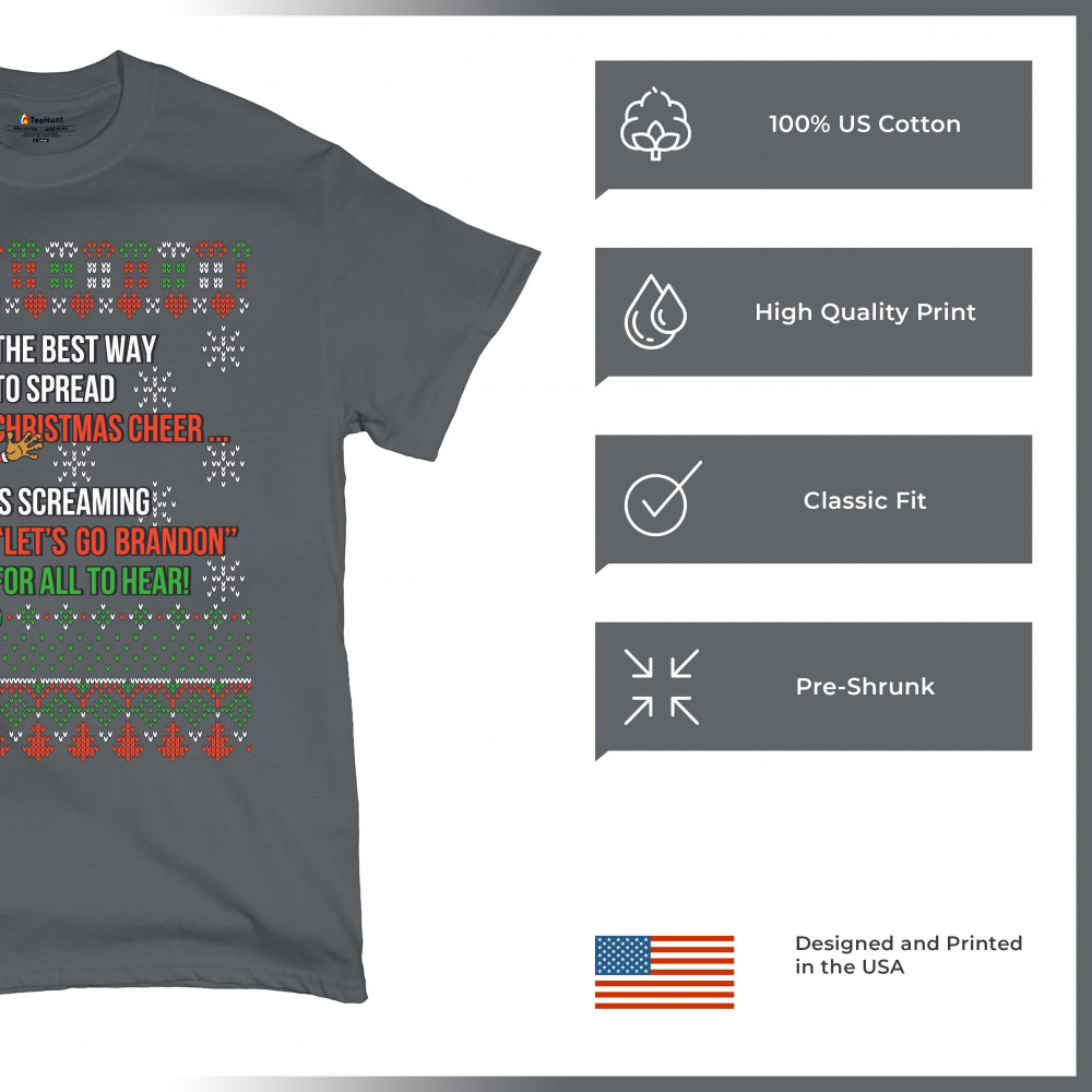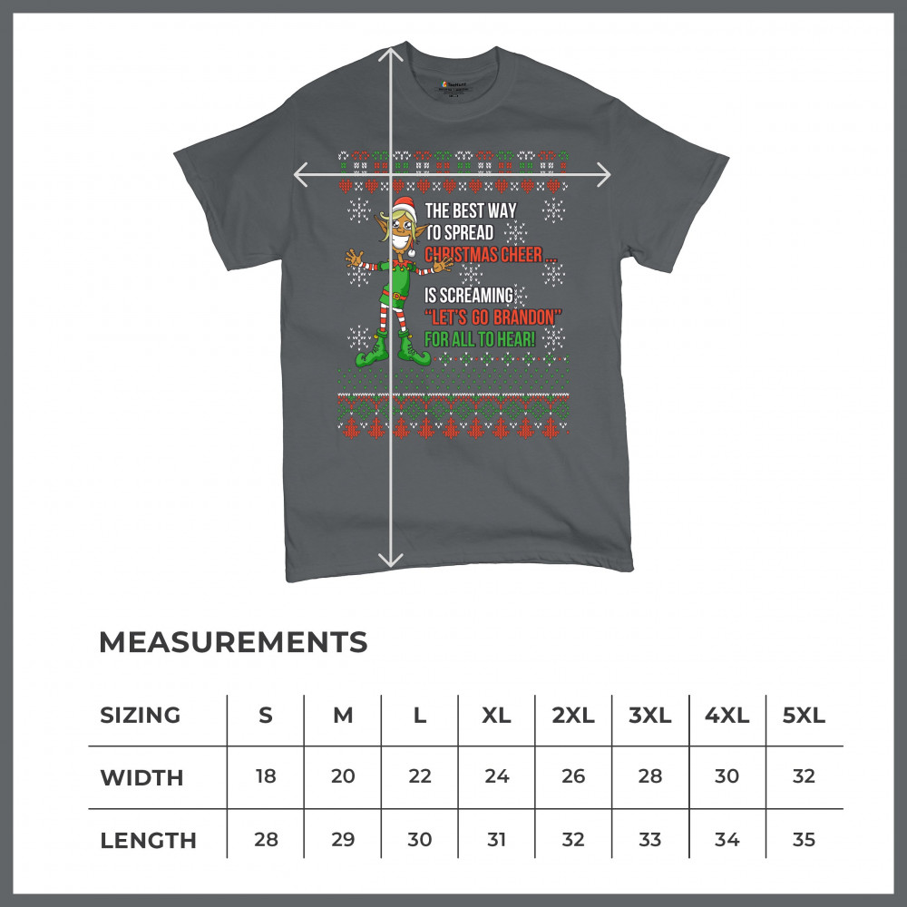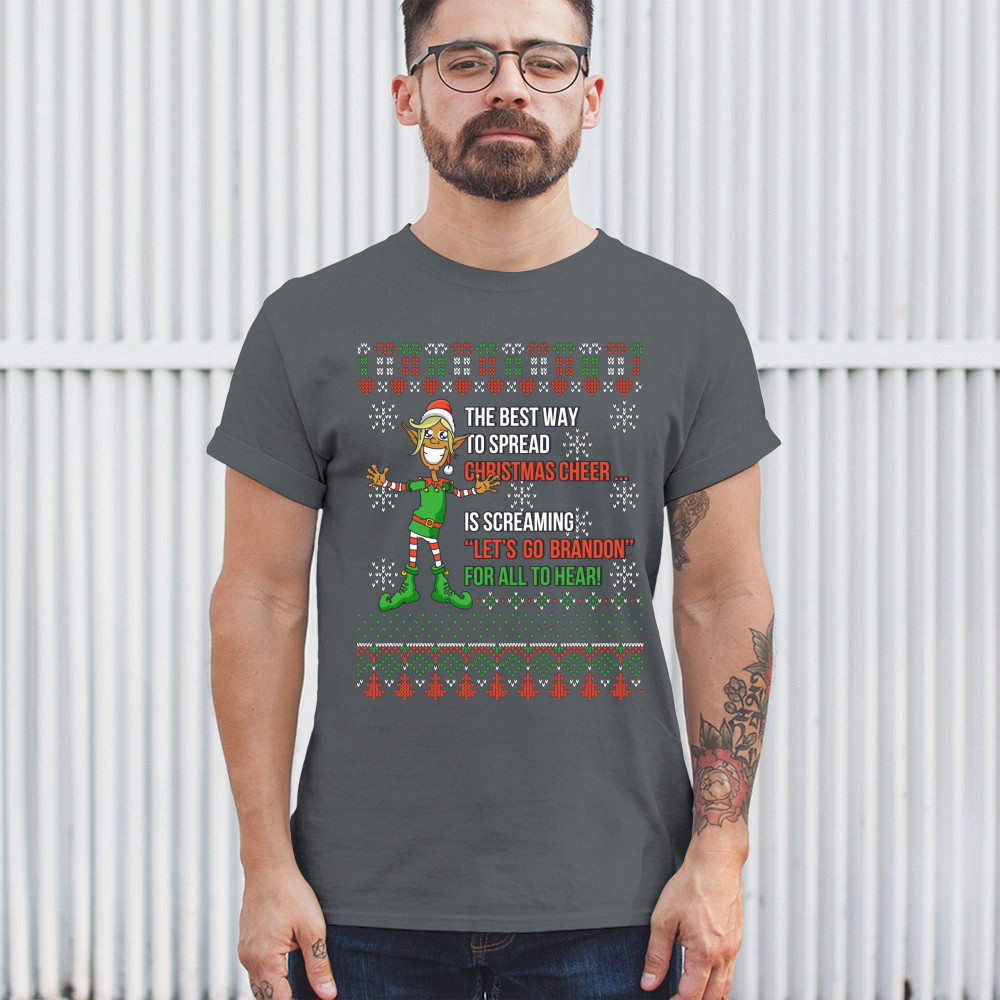 A funny print saying: "The Best Way to Spread Christmas Cheer Is Screaming Let's Go Brandon for All to Hear" and featuring a smiling elf. The print is decorated as a Christmas ugly Sweater. A great choice to wear for a Christmas or New Year's Eve party an