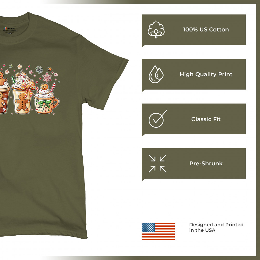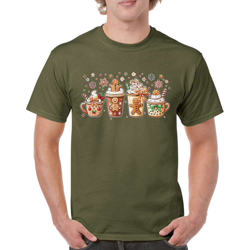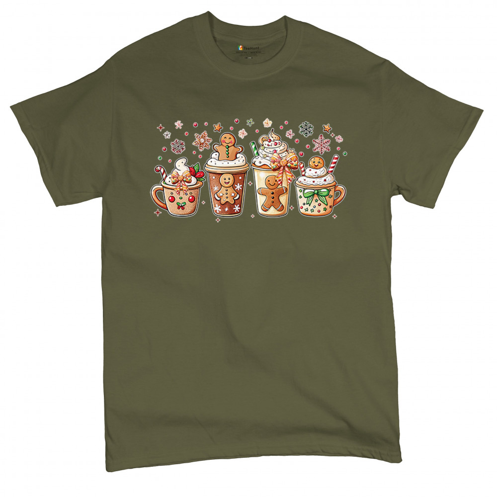 This cute Christmas drink design showcases gingerbread mugs, whipped cream, candy canes, sprinkles, and festive decorations for a warm winter aesthetic. Perfect for cocoa lovers, coffee fans, bakers, cozy holiday nights, gift exchanges, Christmas morning vibes, seasonal parties, and anyone who loves adorable dessert-inspired holiday art.