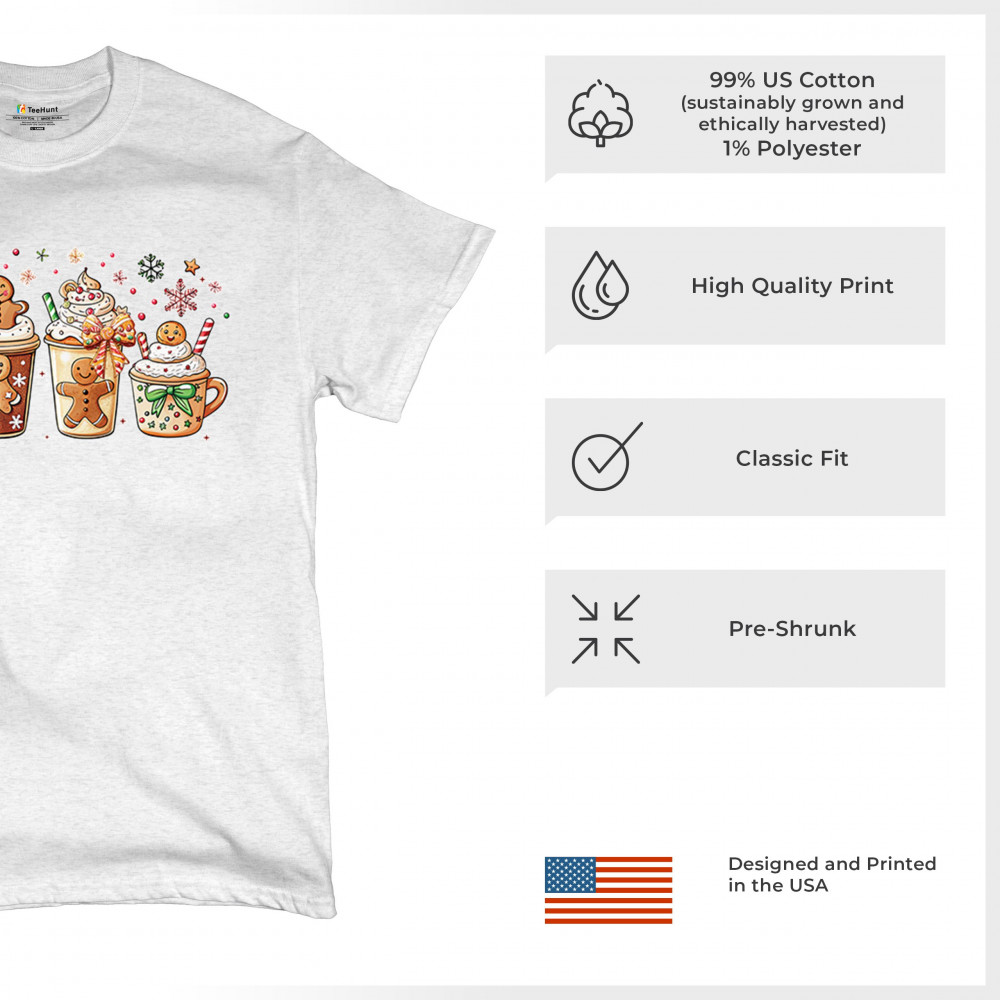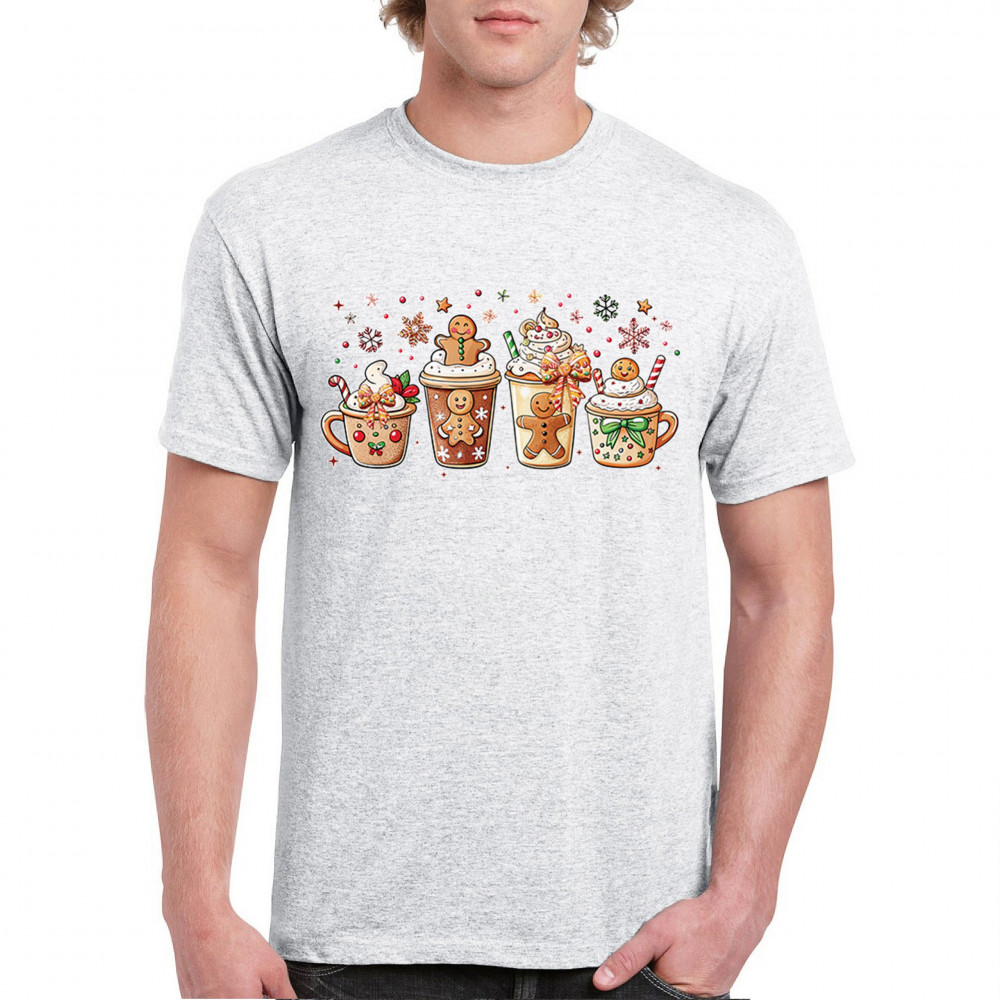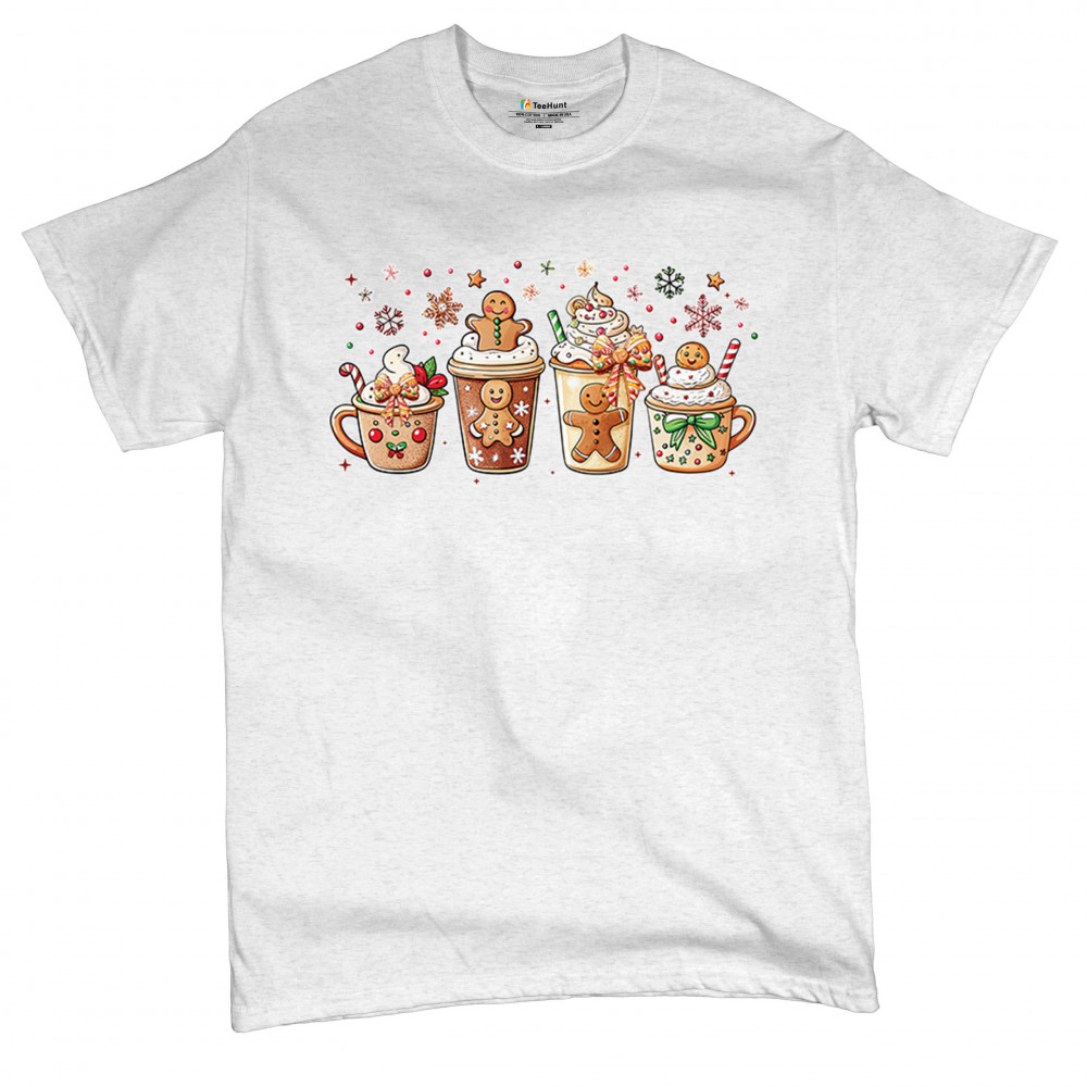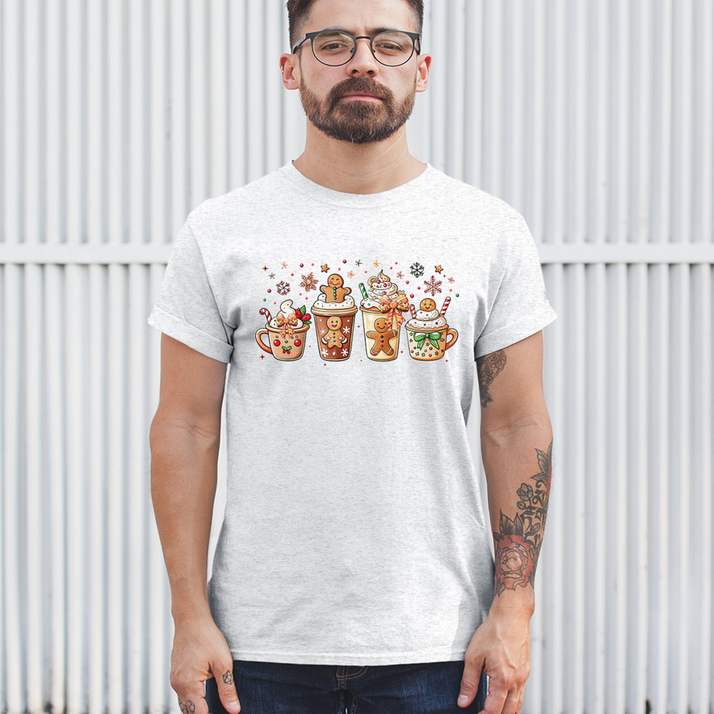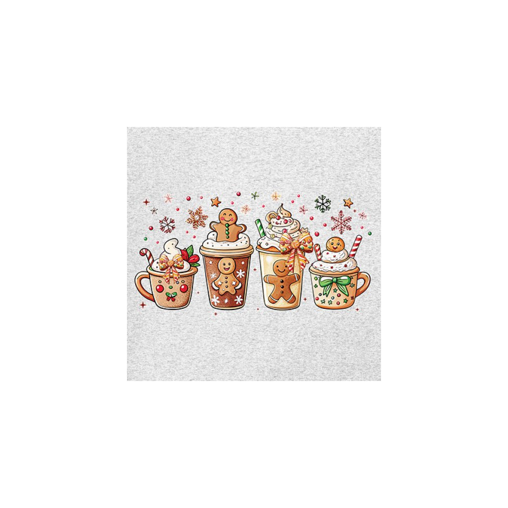 This cute Christmas drink design showcases gingerbread mugs, whipped cream, candy canes, sprinkles, and festive decorations for a warm winter aesthetic. Perfect for cocoa lovers, coffee fans, bakers, cozy holiday nights, gift exchanges, Christmas morning vibes, seasonal parties, and anyone who loves adorable dessert-inspired holiday art.