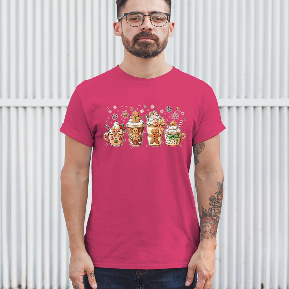 This cute Christmas drink design showcases gingerbread mugs, whipped cream, candy canes, sprinkles, and festive decorations for a warm winter aesthetic. Perfect for cocoa lovers, coffee fans, bakers, cozy holiday nights, gift exchanges, Christmas morning vibes, seasonal parties, and anyone who loves adorable dessert-inspired holiday art.