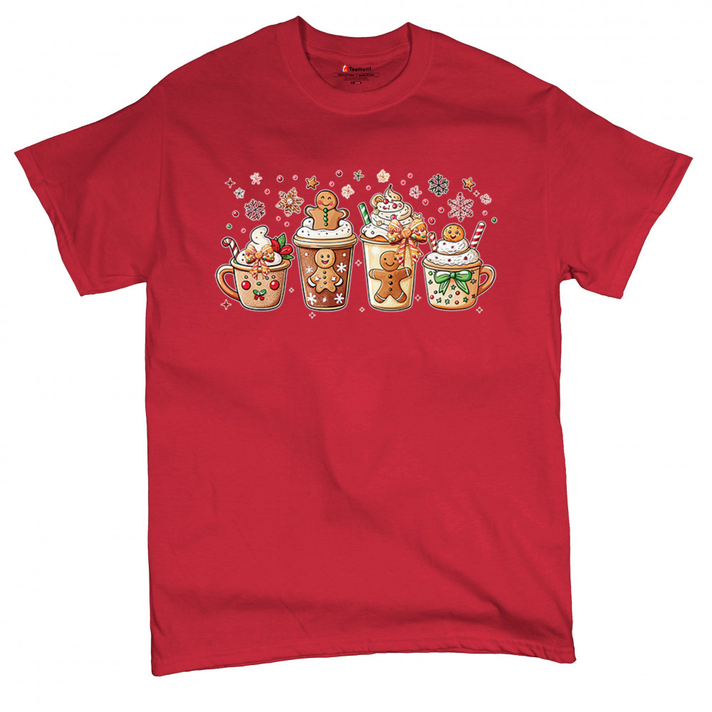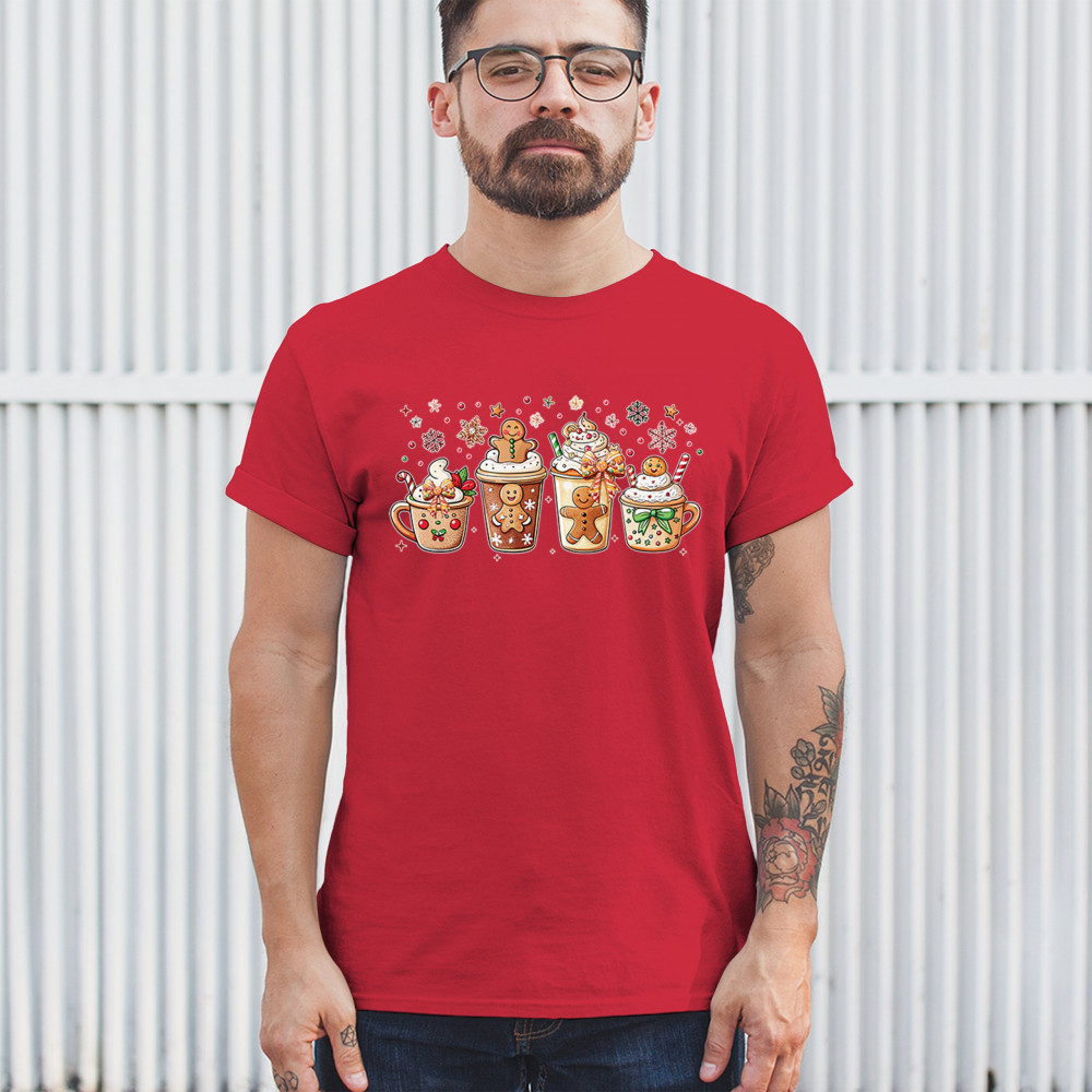 This cute Christmas drink design showcases gingerbread mugs, whipped cream, candy canes, sprinkles, and festive decorations for a warm winter aesthetic. Perfect for cocoa lovers, coffee fans, bakers, cozy holiday nights, gift exchanges, Christmas morning vibes, seasonal parties, and anyone who loves adorable dessert-inspired holiday art.
