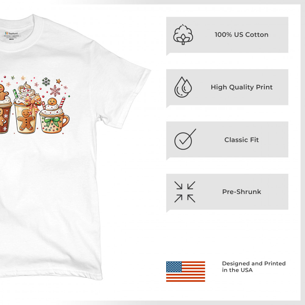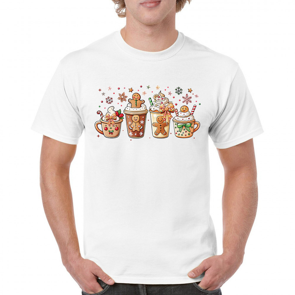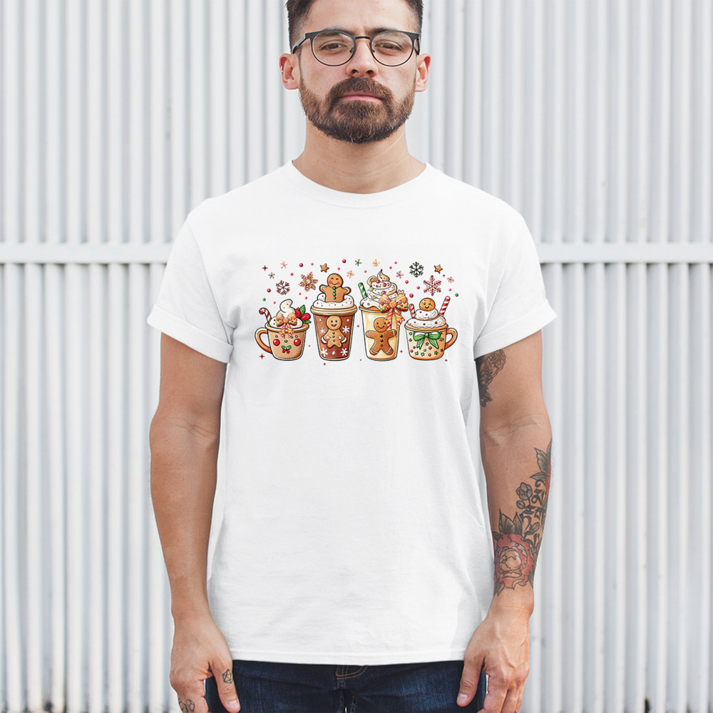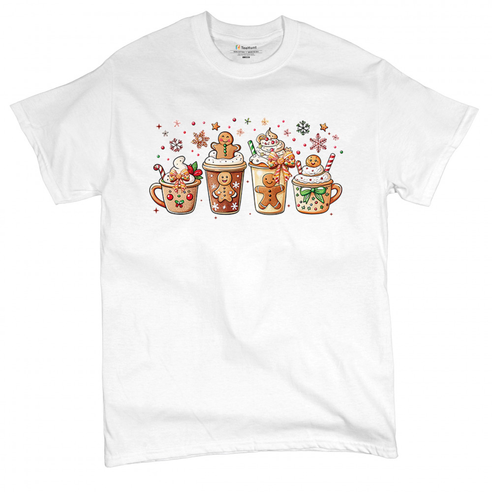 This cute Christmas drink design showcases gingerbread mugs, whipped cream, candy canes, sprinkles, and festive decorations for a warm winter aesthetic. Perfect for cocoa lovers, coffee fans, bakers, cozy holiday nights, gift exchanges, Christmas morning vibes, seasonal parties, and anyone who loves adorable dessert-inspired holiday art.