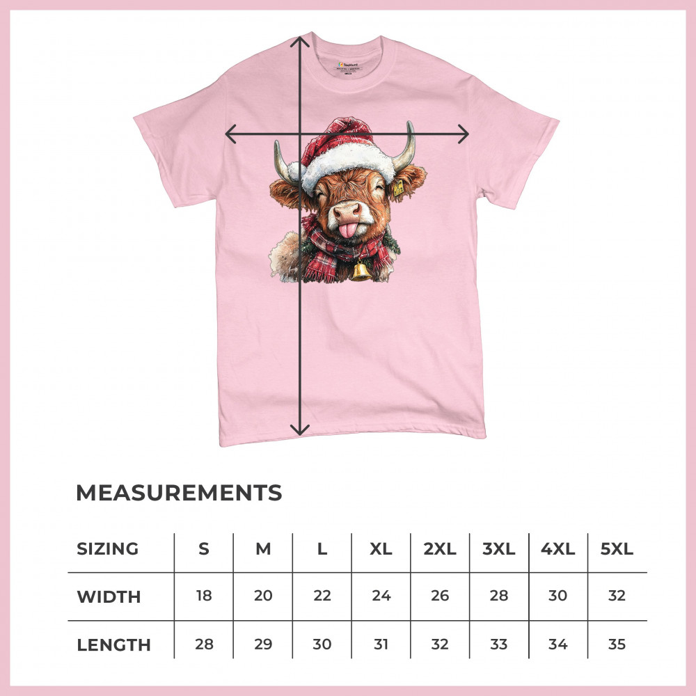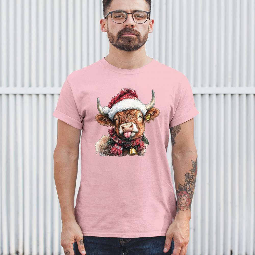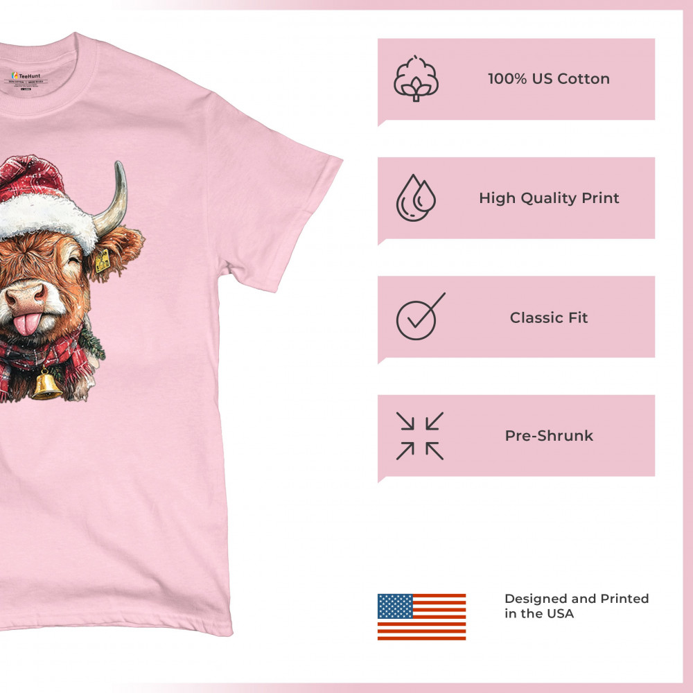 Christmas Highland Cow shirt – rustic holiday design with Santa hat cow, farmhouse holiday humor, country Christmas vibes, and festive livestock art.