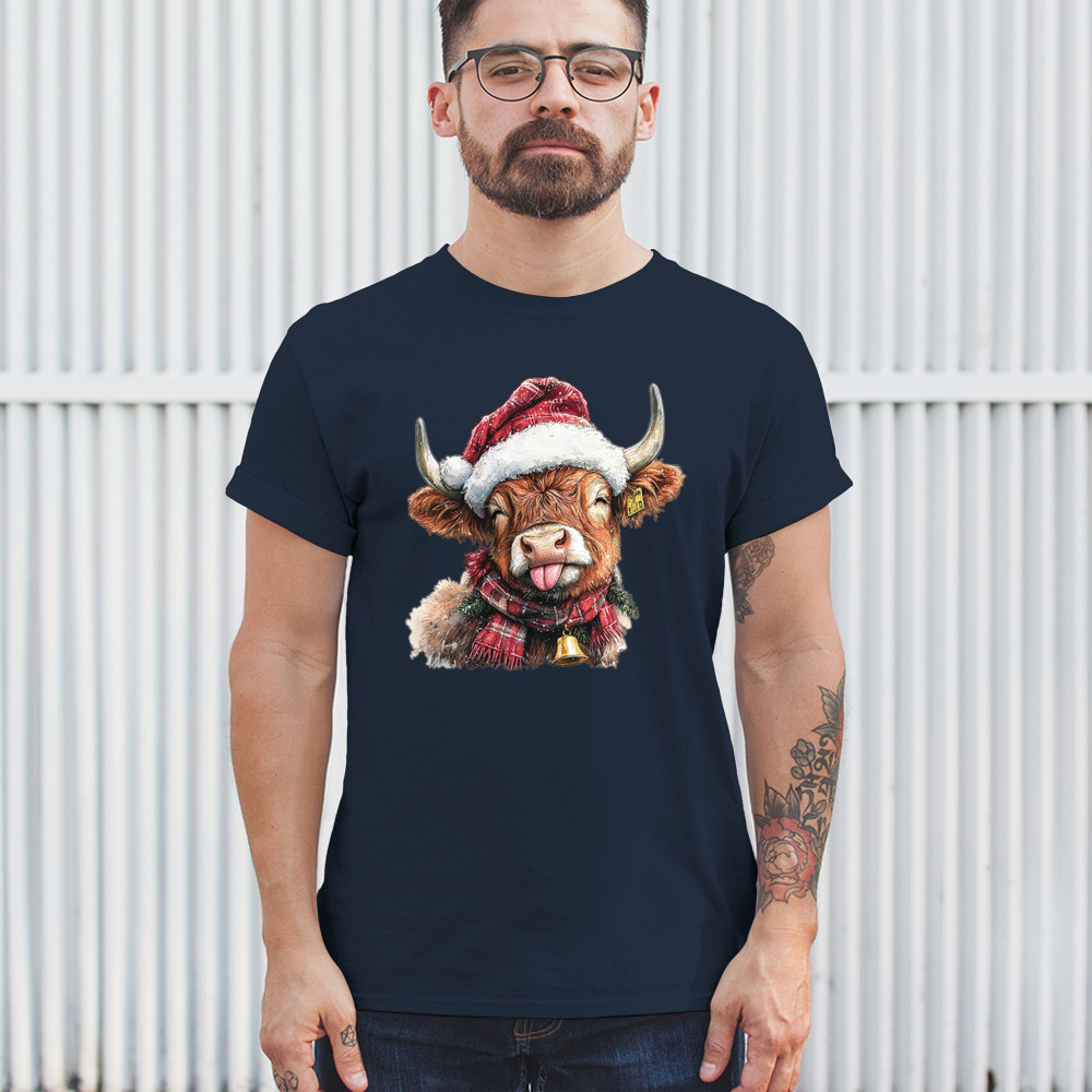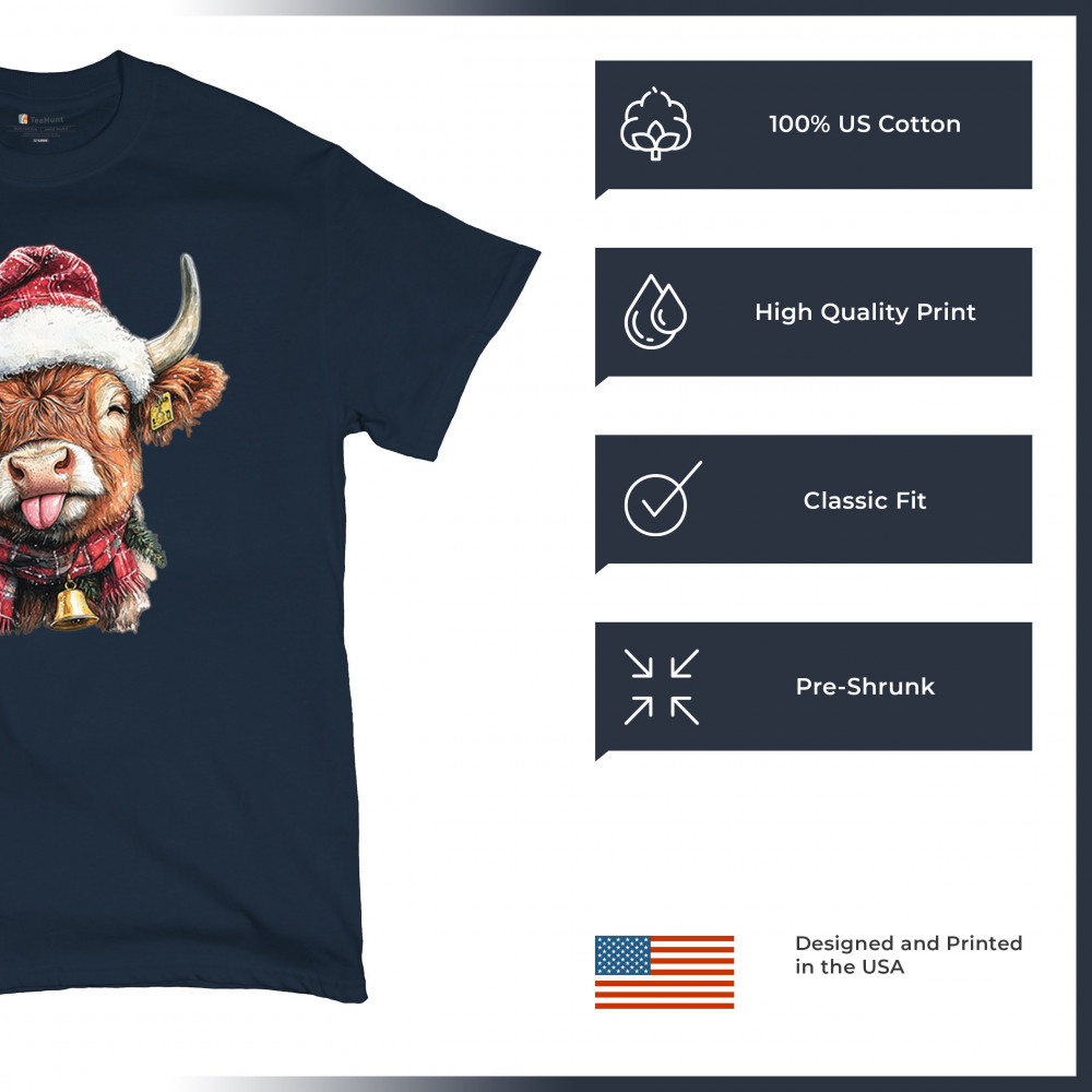 Christmas Highland Cow shirt – rustic holiday design with Santa hat cow, farmhouse holiday humor, country Christmas vibes, and festive livestock art.