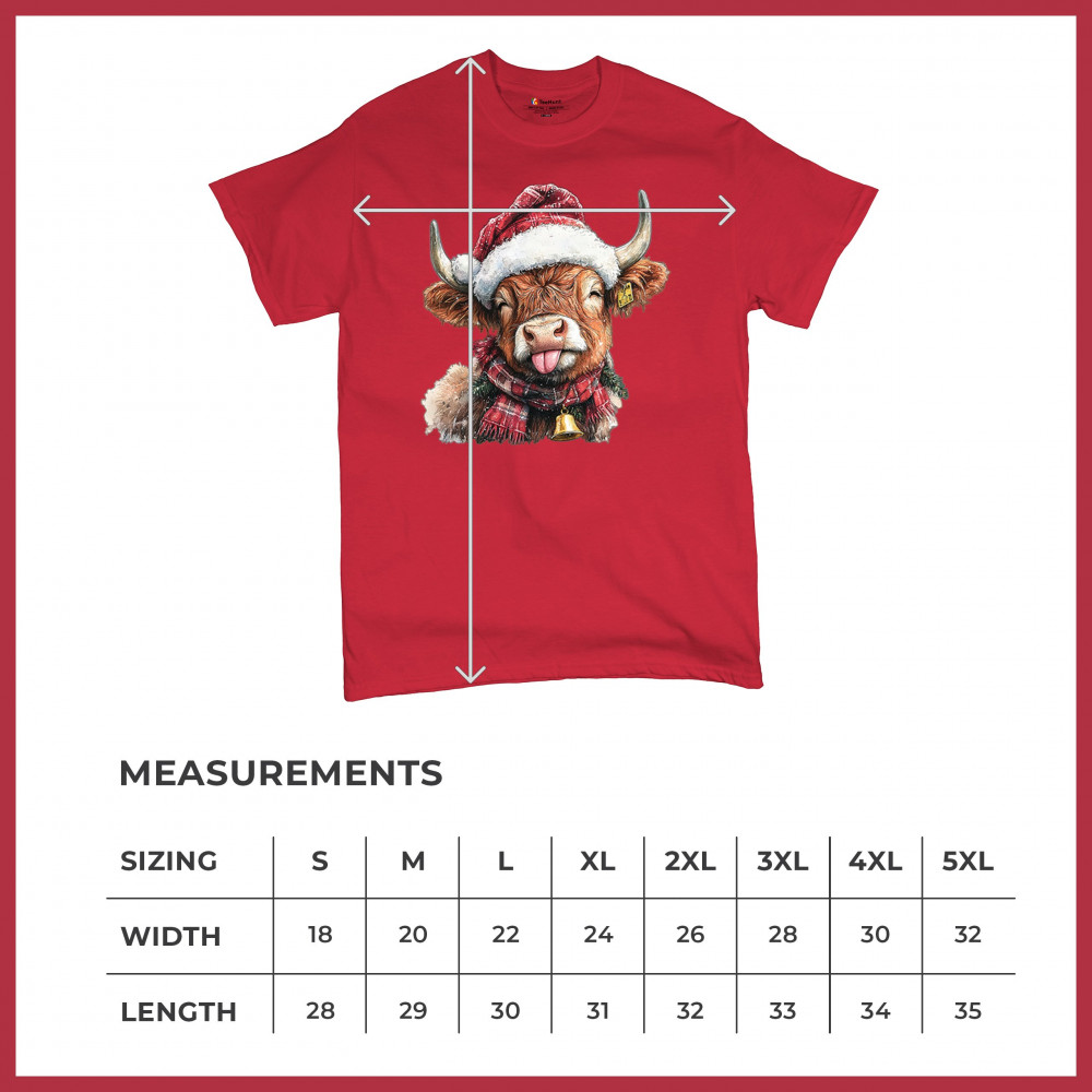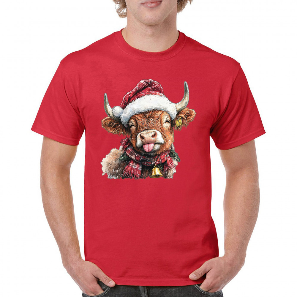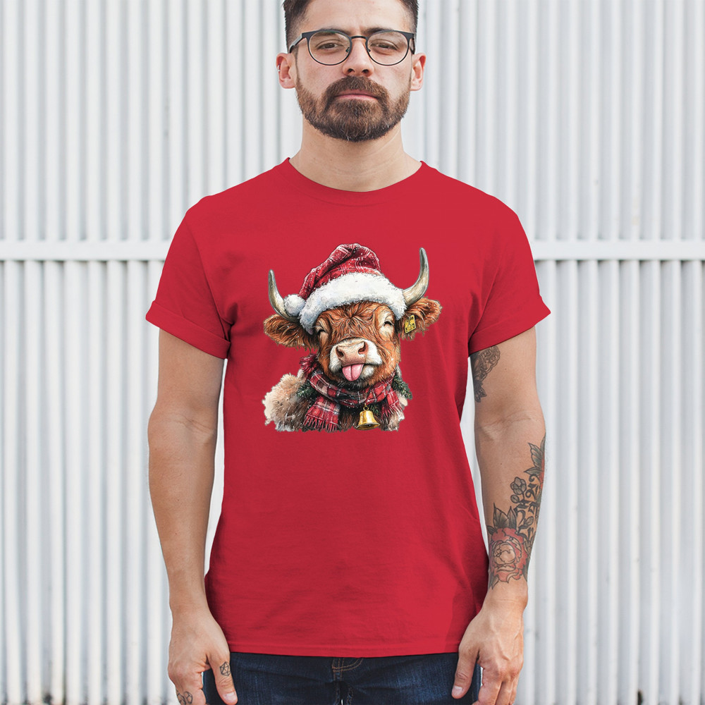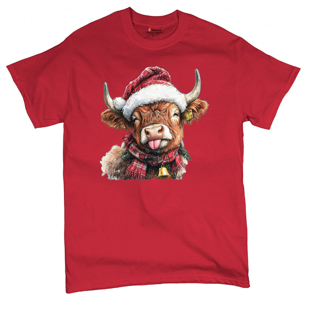 Christmas Highland Cow shirt – rustic holiday design with Santa hat cow, farmhouse holiday humor, country Christmas vibes, and festive livestock art.