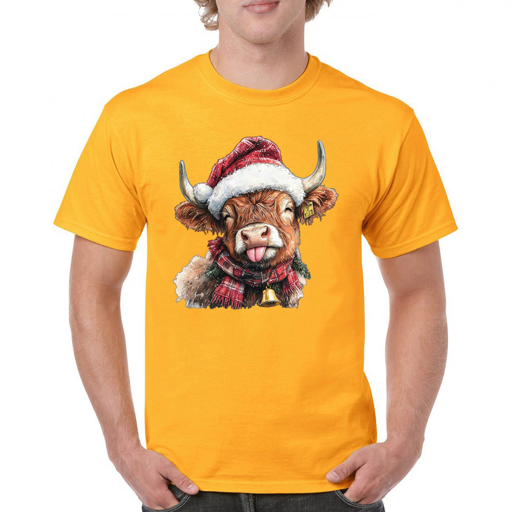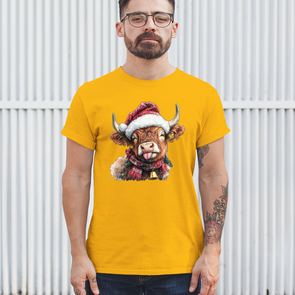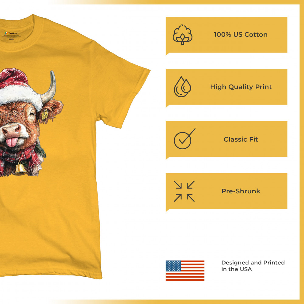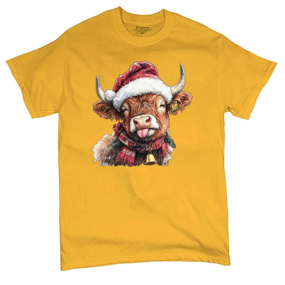 Christmas Highland Cow shirt – rustic holiday design with Santa hat cow, farmhouse holiday humor, country Christmas vibes, and festive livestock art.