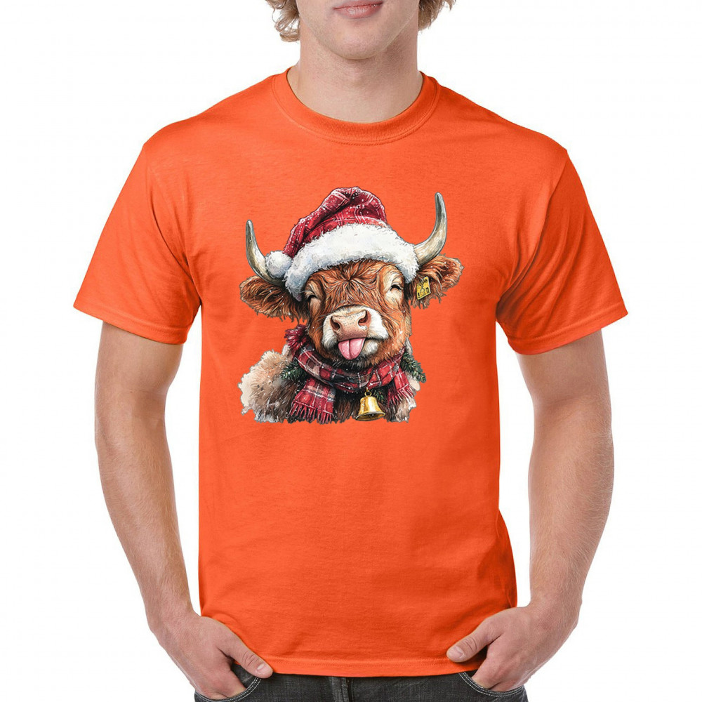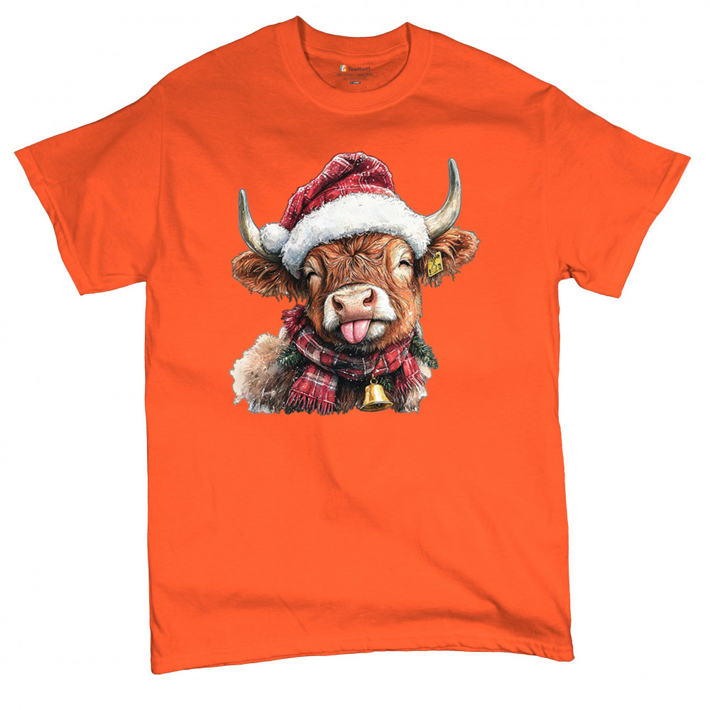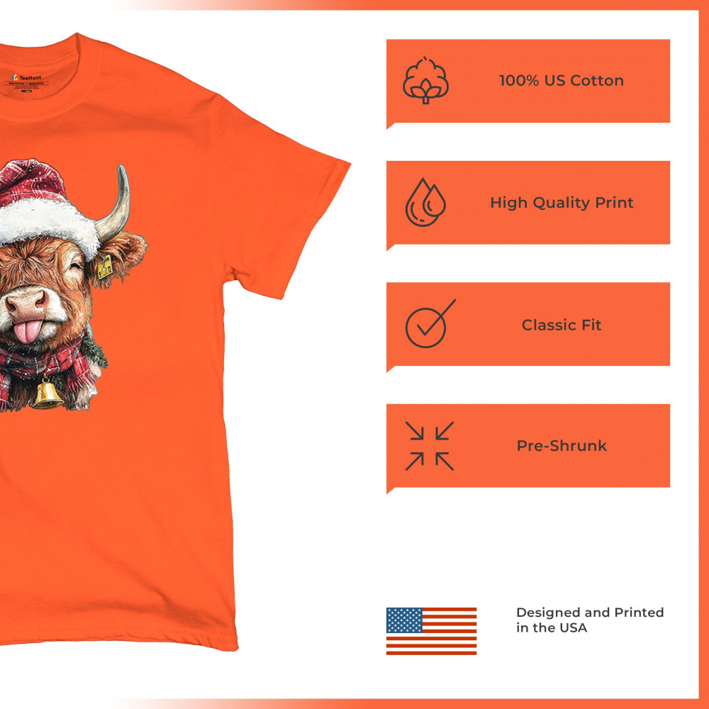 Christmas Highland Cow shirt – rustic holiday design with Santa hat cow, farmhouse holiday humor, country Christmas vibes, and festive livestock art.