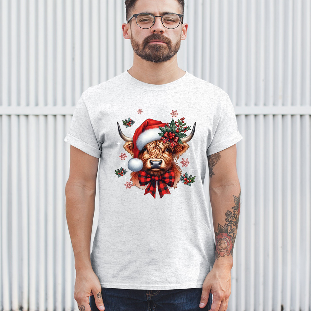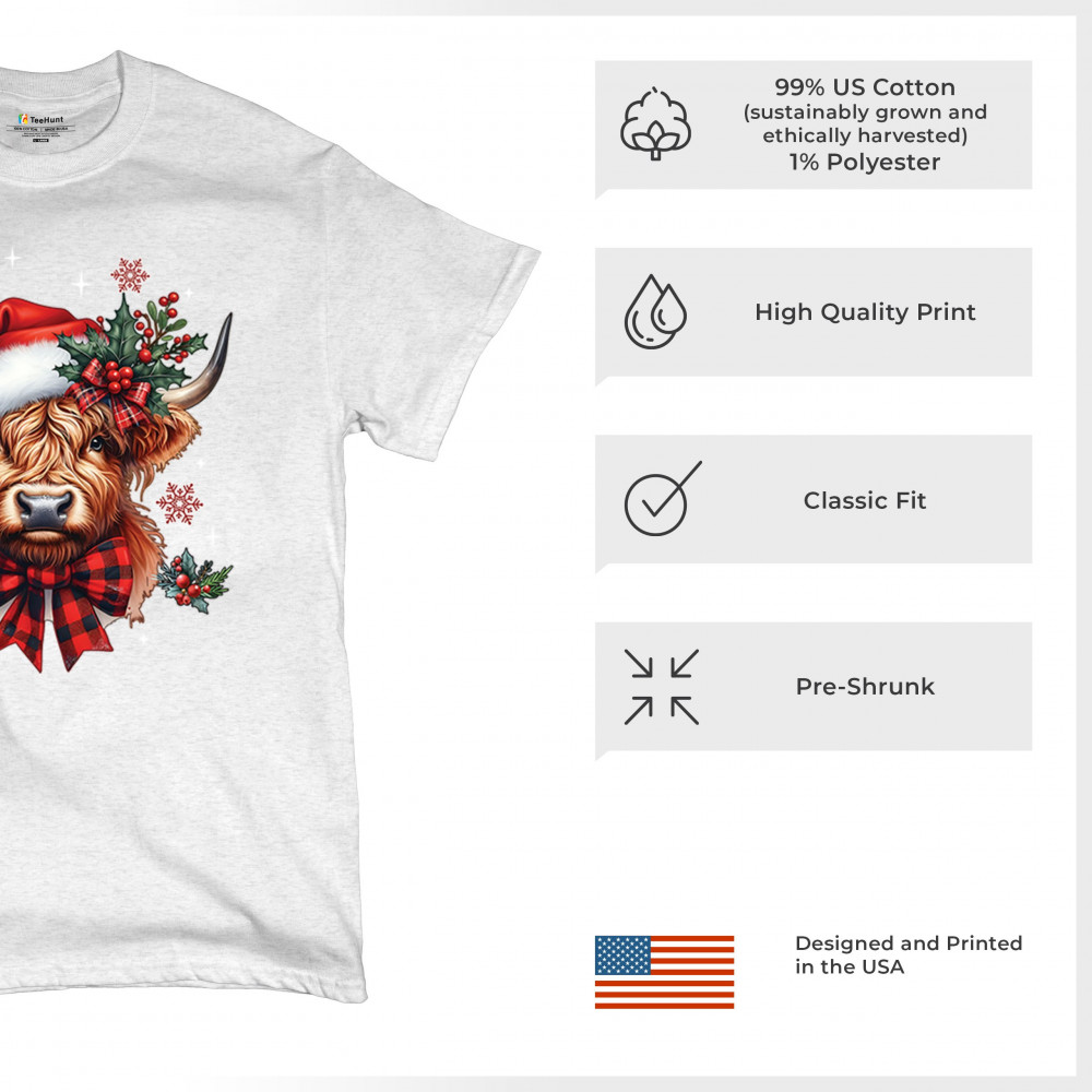 Festive Highland cow Christmas design with Santa hat, plaid bow, holly, and rustic farmhouse holiday charm. Perfect for cozy winter decor.