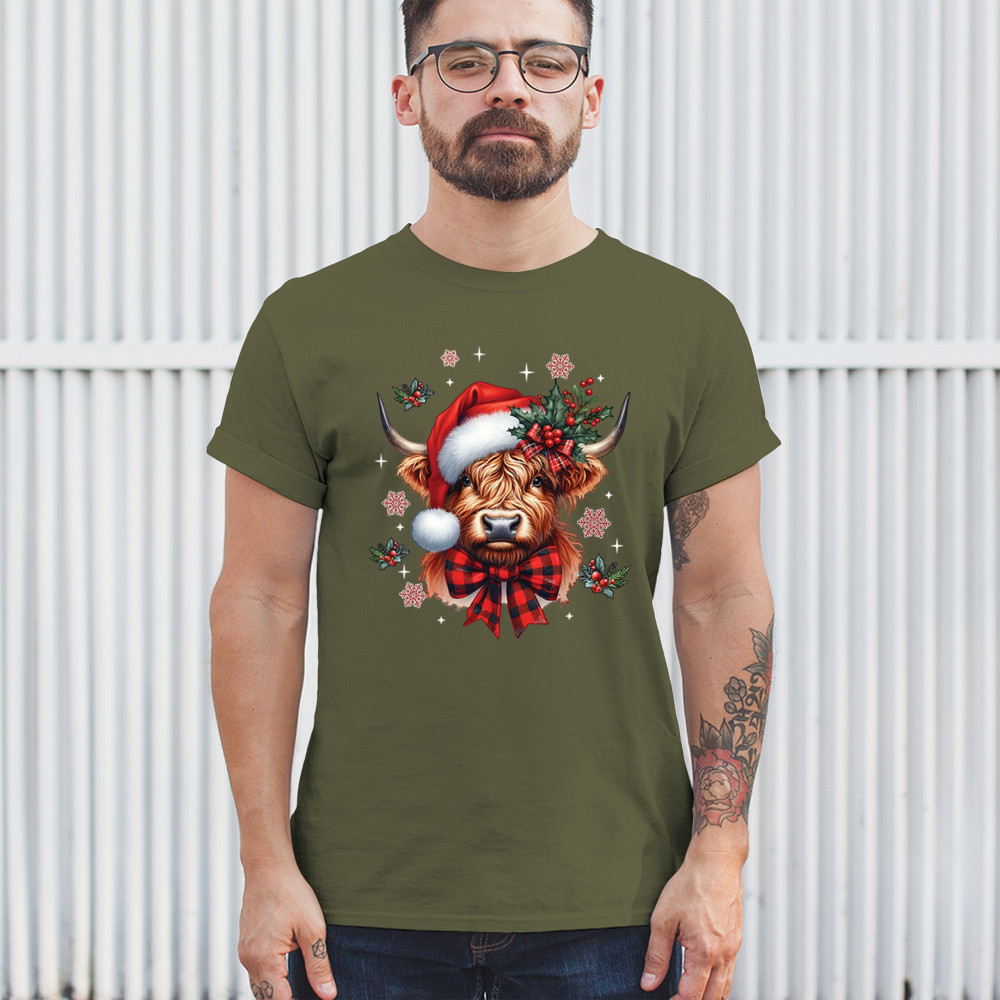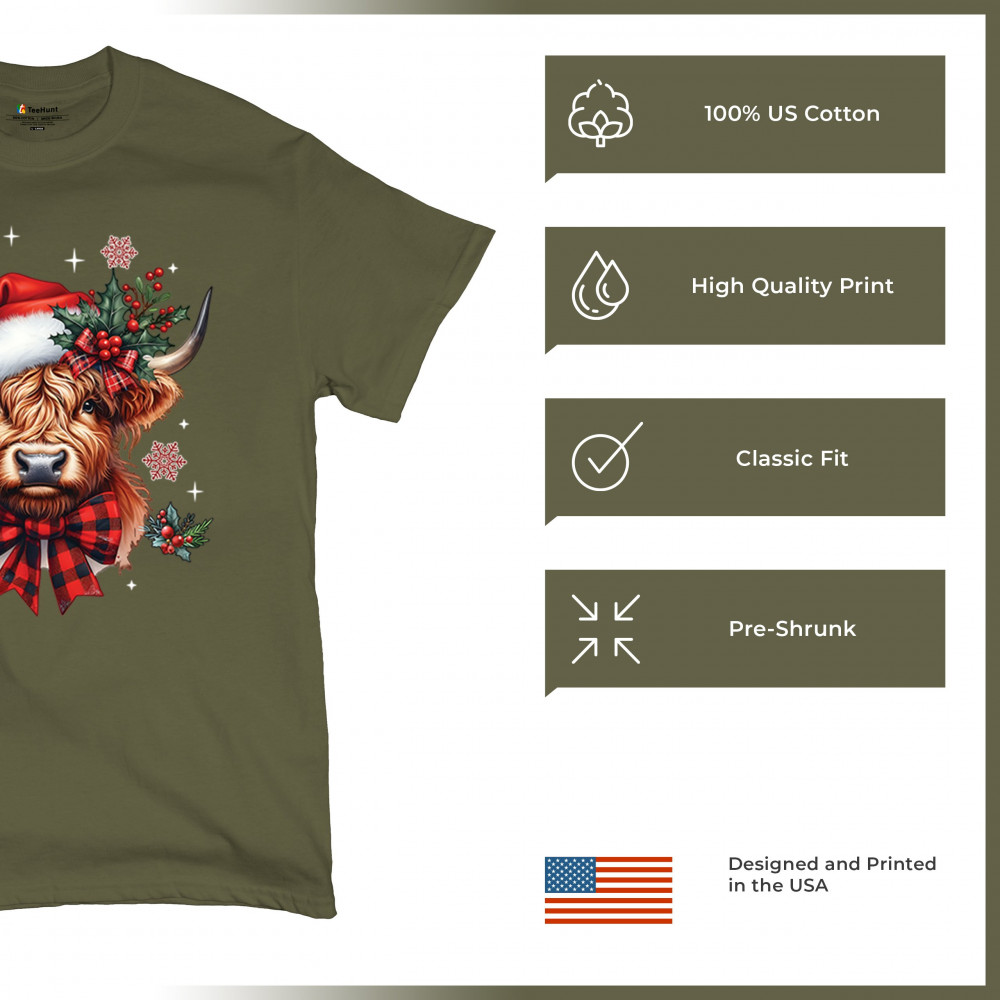 Festive Highland cow Christmas design with Santa hat, plaid bow, holly, and rustic farmhouse holiday charm. Perfect for cozy winter decor.