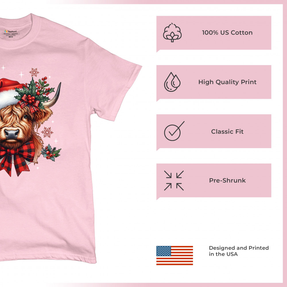 Festive Highland cow Christmas design with Santa hat, plaid bow, holly, and rustic farmhouse holiday charm. Perfect for cozy winter decor.