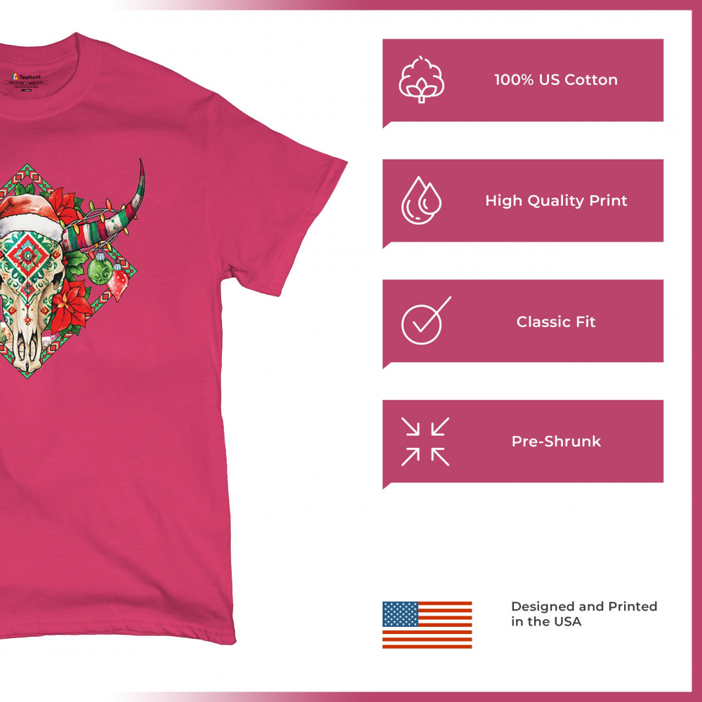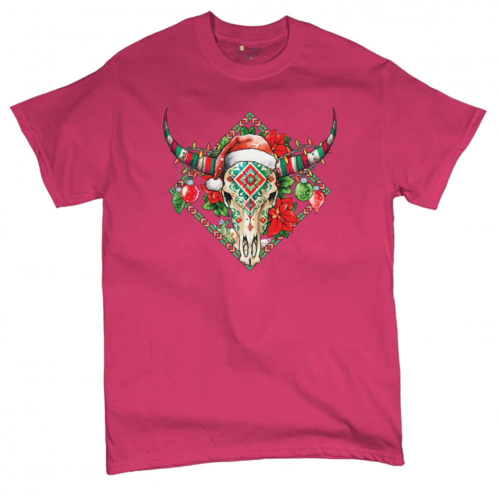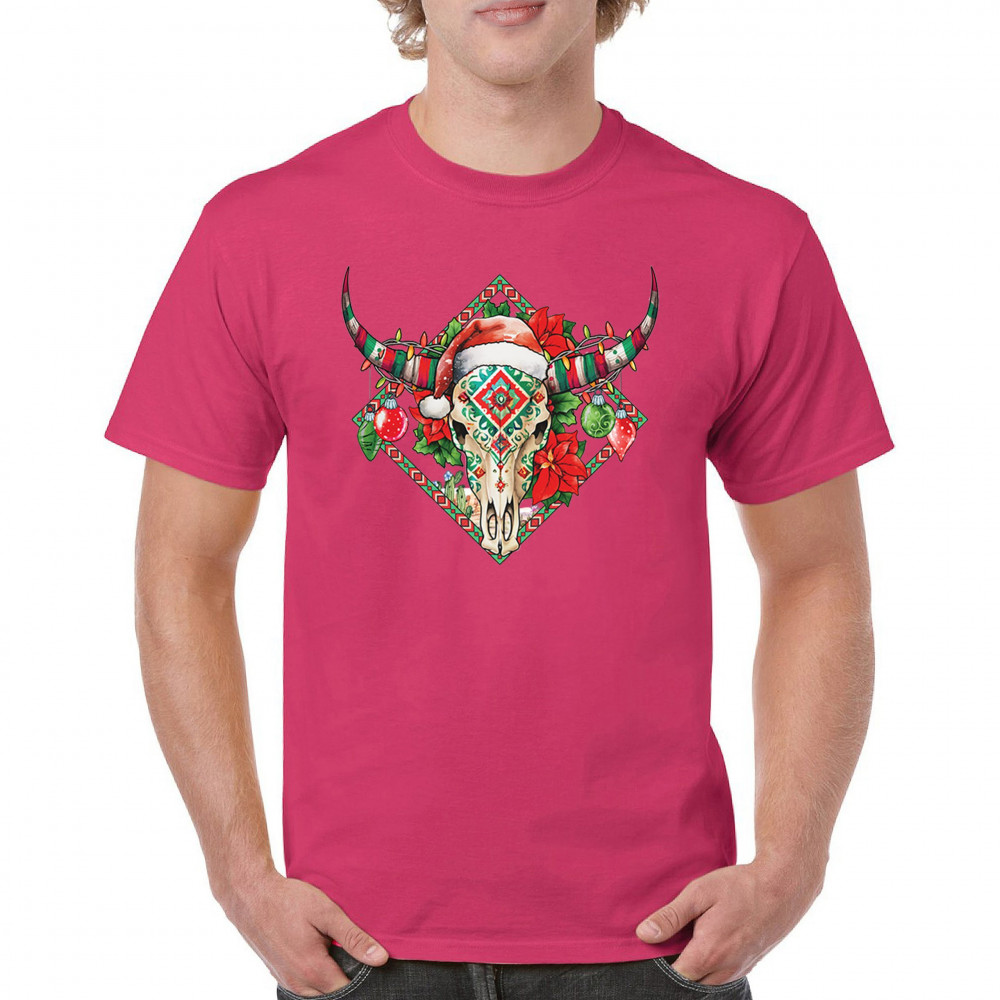Blend Southwestern charm with holiday cheer! This vibrant skull design with poinsettias and ornaments is perfect for festive parties and unique gifts!