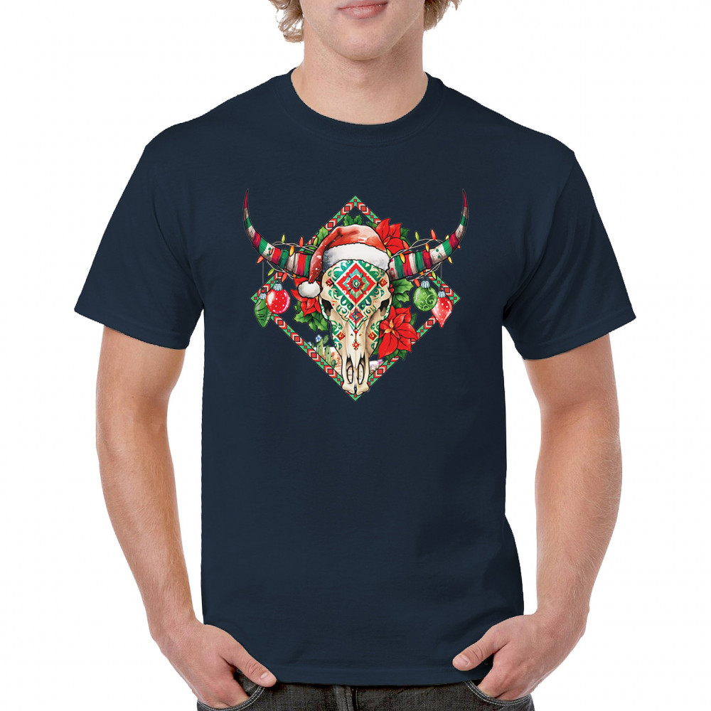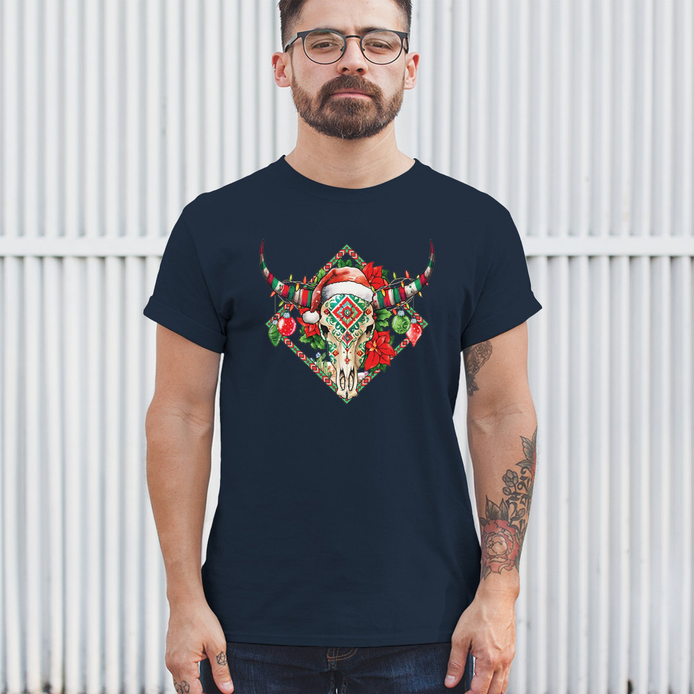 Blend Southwestern charm with holiday cheer! This vibrant skull design with poinsettias and ornaments is perfect for festive parties and unique gifts!