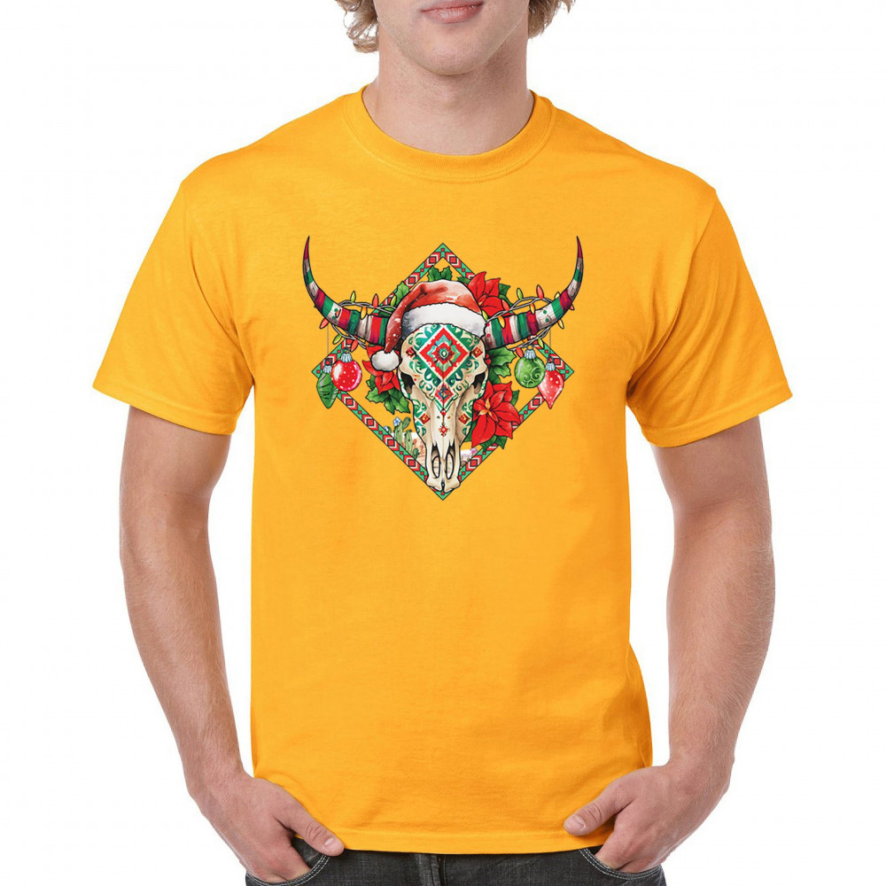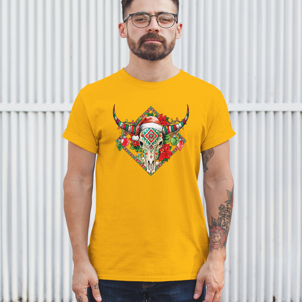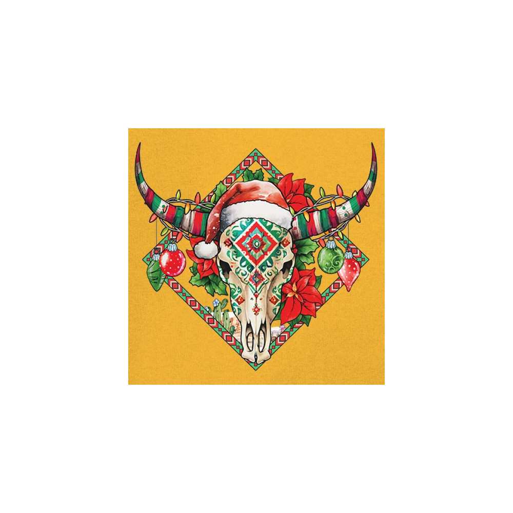 Blend Southwestern charm with holiday cheer! This vibrant skull design with poinsettias and ornaments is perfect for festive parties and unique gifts!