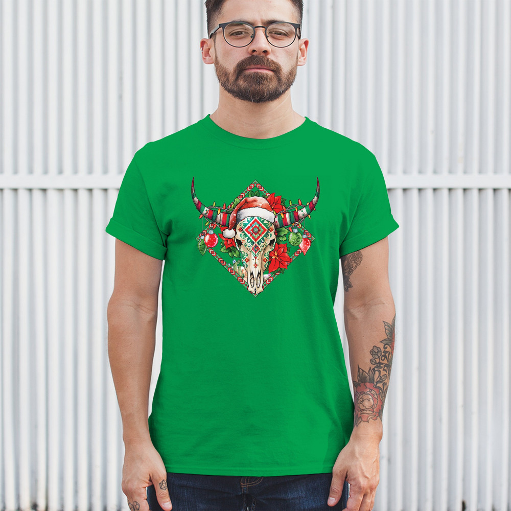 Blend Southwestern charm with holiday cheer! This vibrant skull design with poinsettias and ornaments is perfect for festive parties and unique gifts!