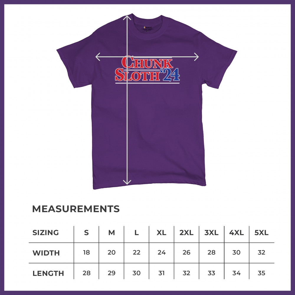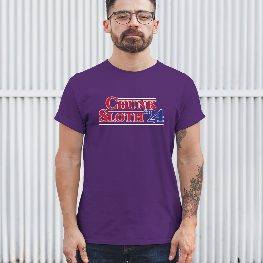 Celebrate 80s nostalgia and political humor with our Chunk and Sloth '24 design. Perfect for casual wear, movie nights, and themed parties. Durable and stylish.