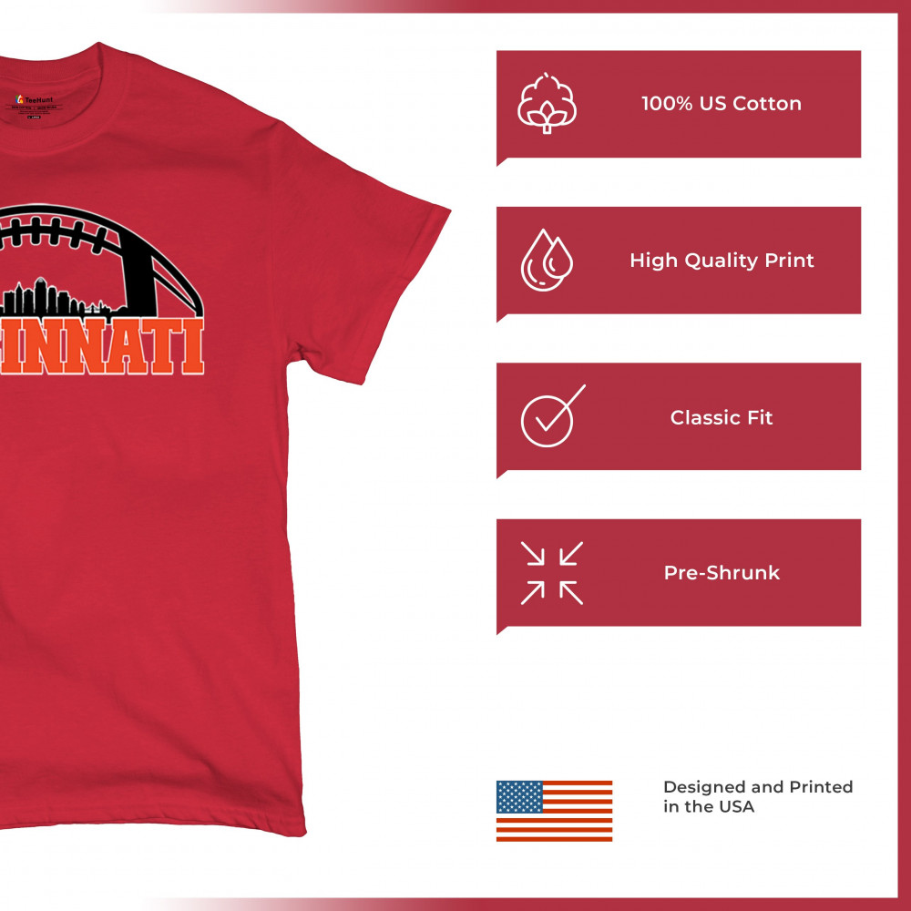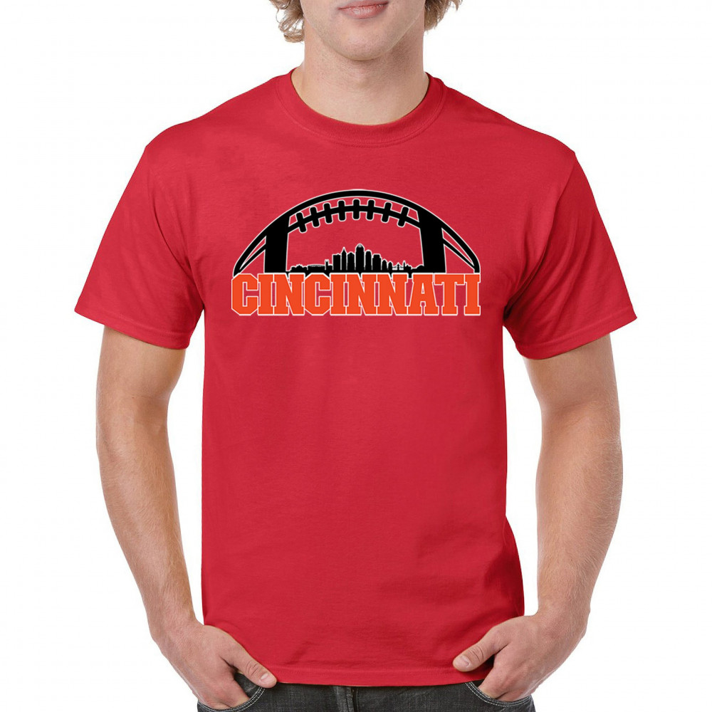Celebrate Cincinnati and football with this bold skyline design under a football arch. Perfect for fans, tailgates, and game days!