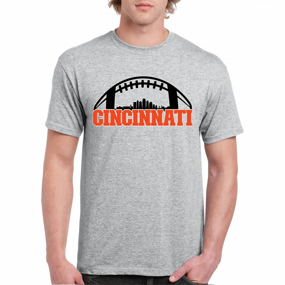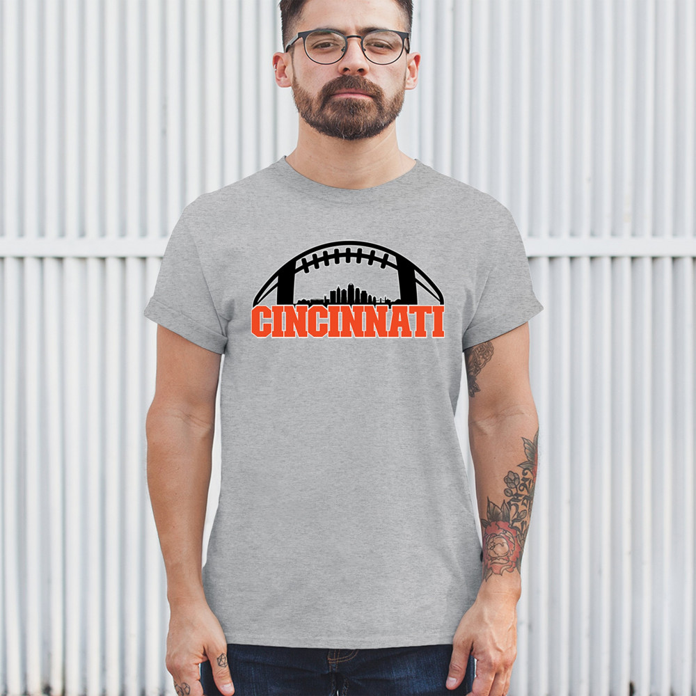 Celebrate Cincinnati and football with this bold skyline design under a football arch. Perfect for fans, tailgates, and game days!