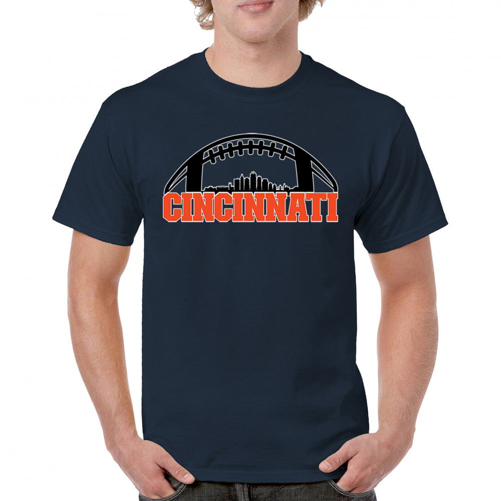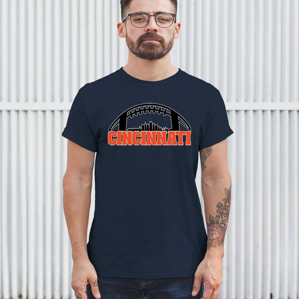 Celebrate Cincinnati and football with this bold skyline design under a football arch. Perfect for fans, tailgates, and game days!