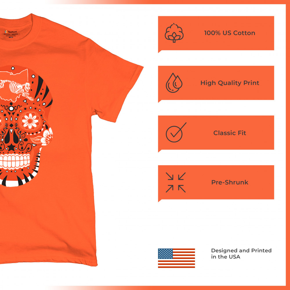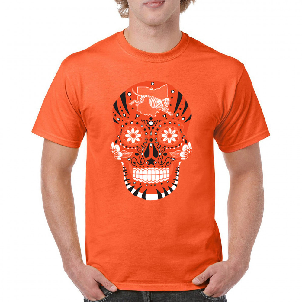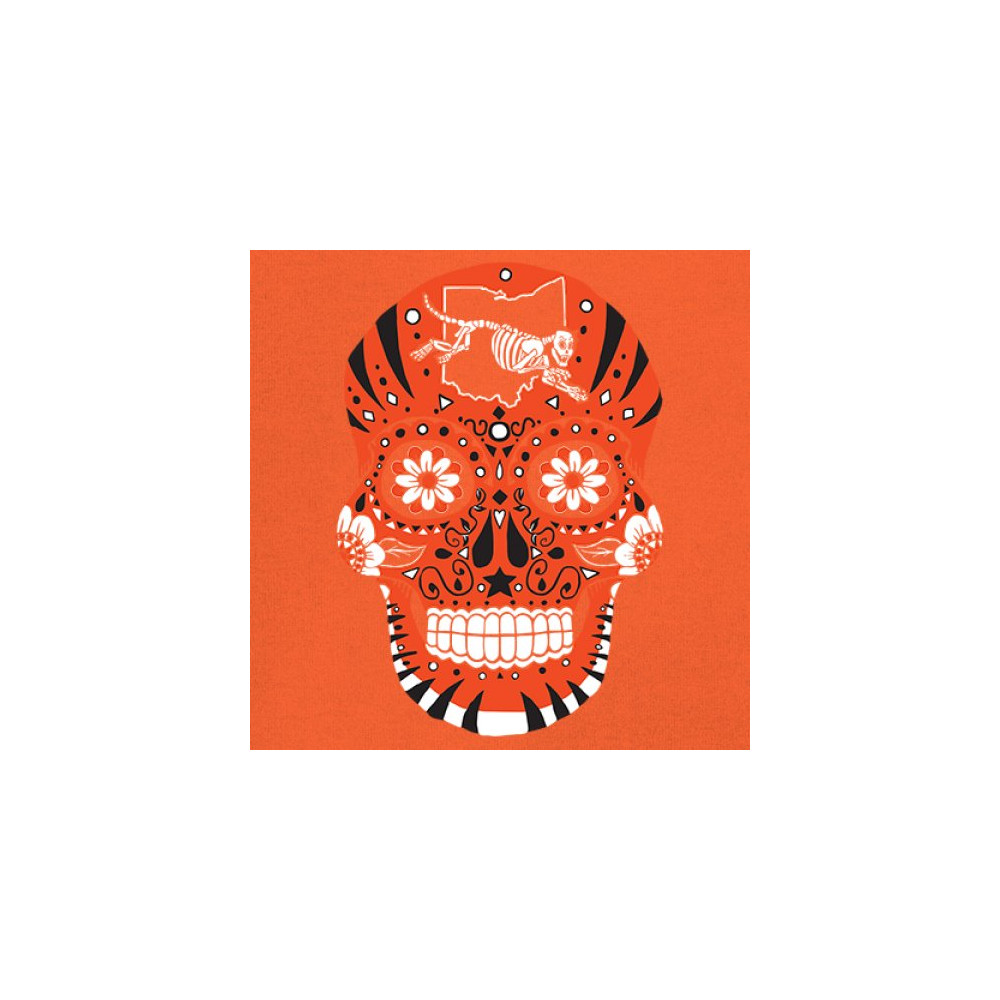 Cinci Sugar Skull with Queen City Paw, underdog grit, black & orange pride, Game Day energy, and playoff vibes.