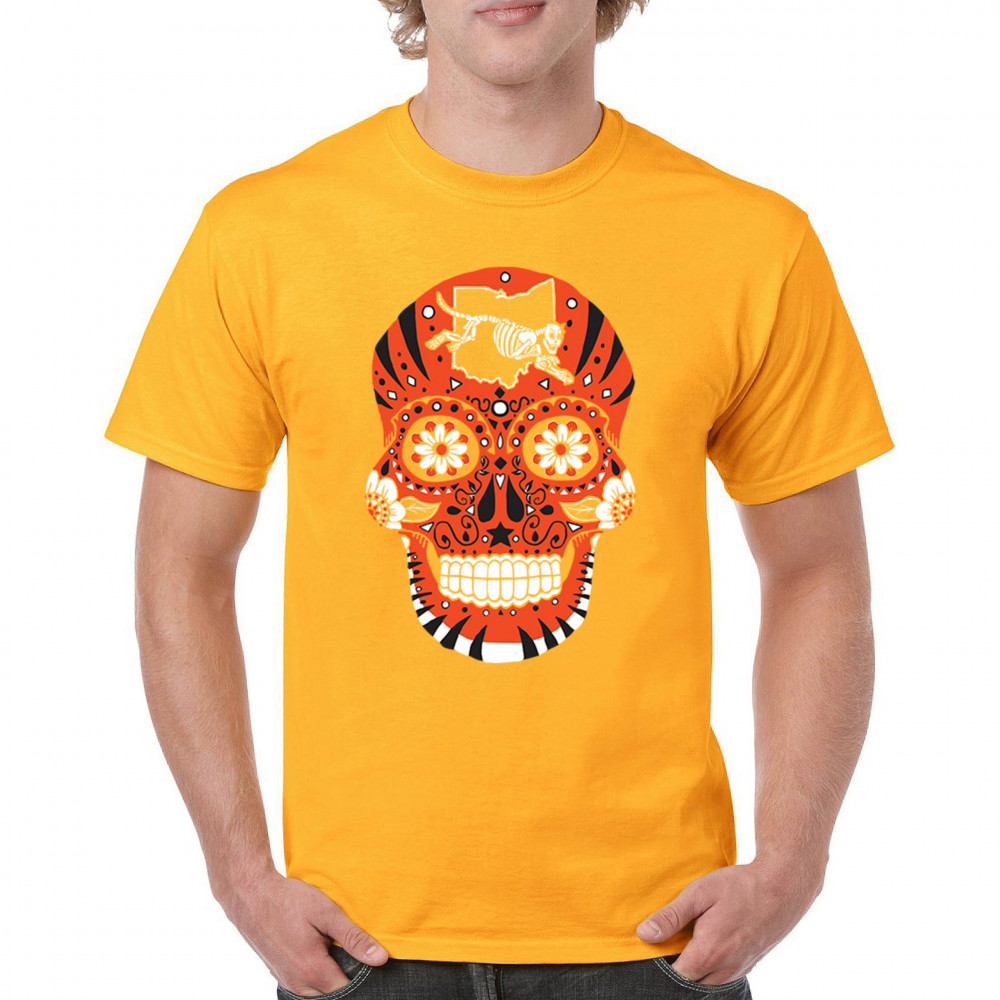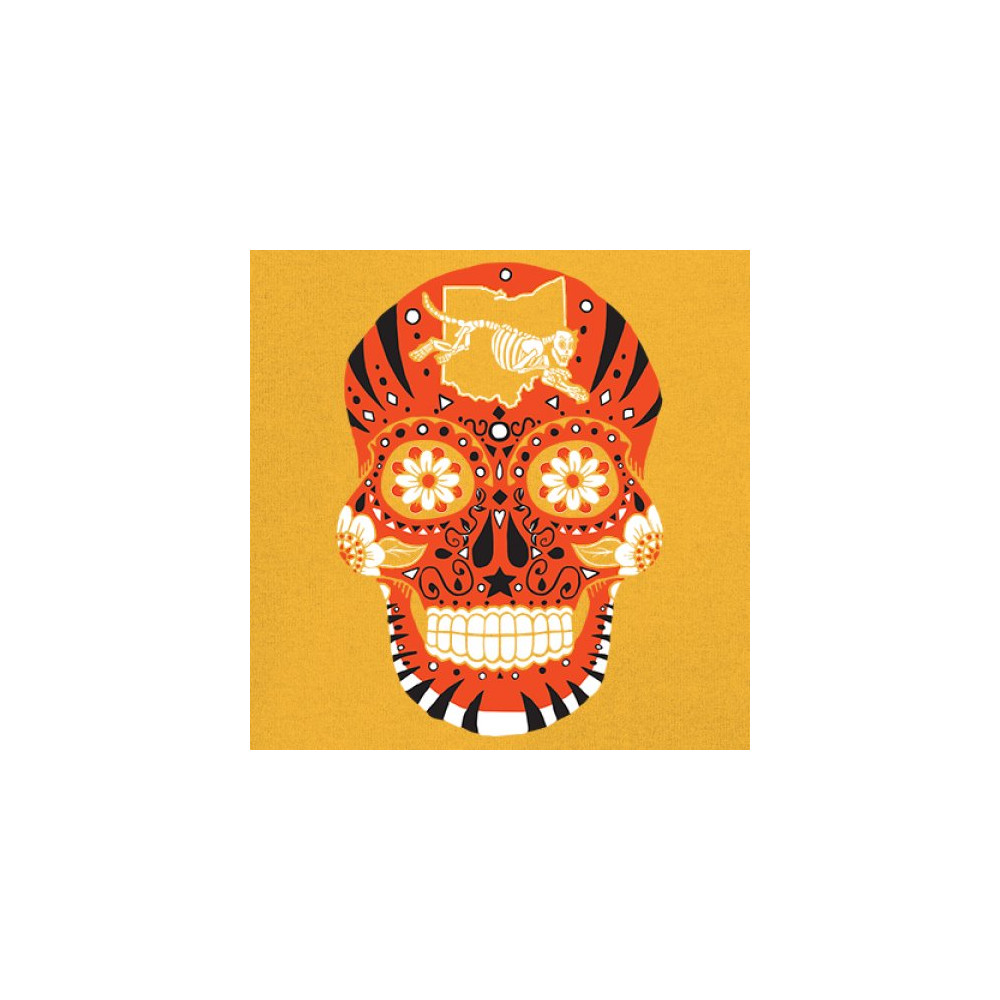 Cinci Sugar Skull with Queen City Paw, underdog grit, black & orange pride, Game Day energy, and playoff vibes.