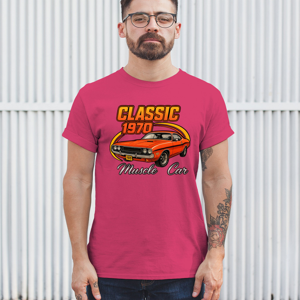 Show your pride for American muscle with this bold 1970 design featuring a classic orange coupe in retro detail. Perfect for gearheads, vintage car lovers, and collectors who live for the sound of old-school performance. A tribute to the raw attitude and street dominance of 1970 muscle.