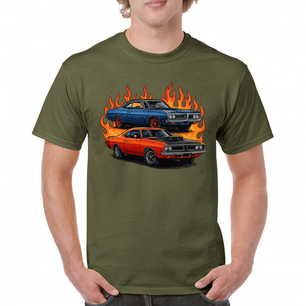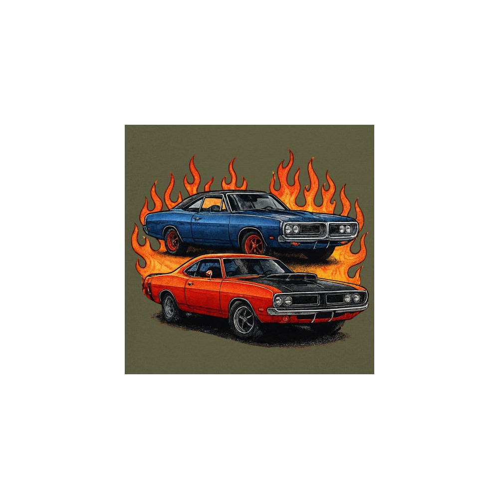 Bold flame design with classic muscle cars for gearheads and vintage horsepower lovers. Perfect for shows, cruise meets, and burnout nights.