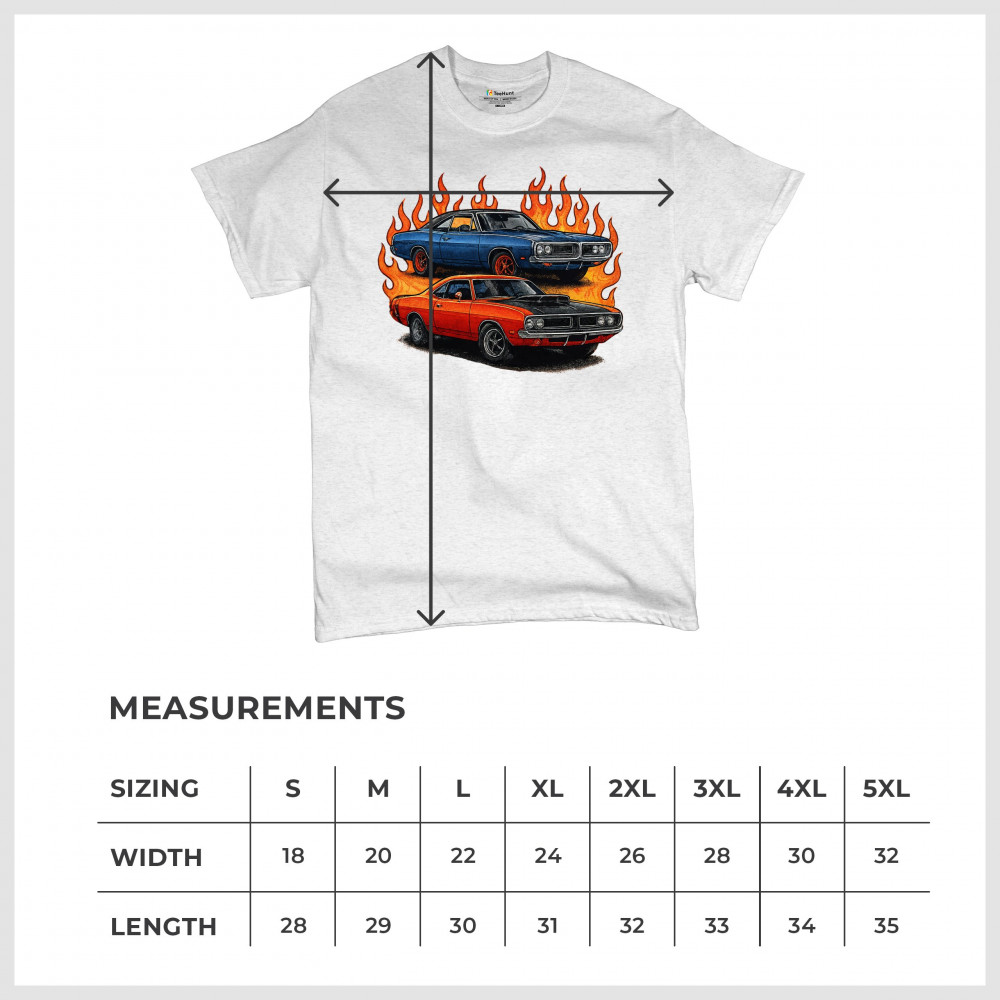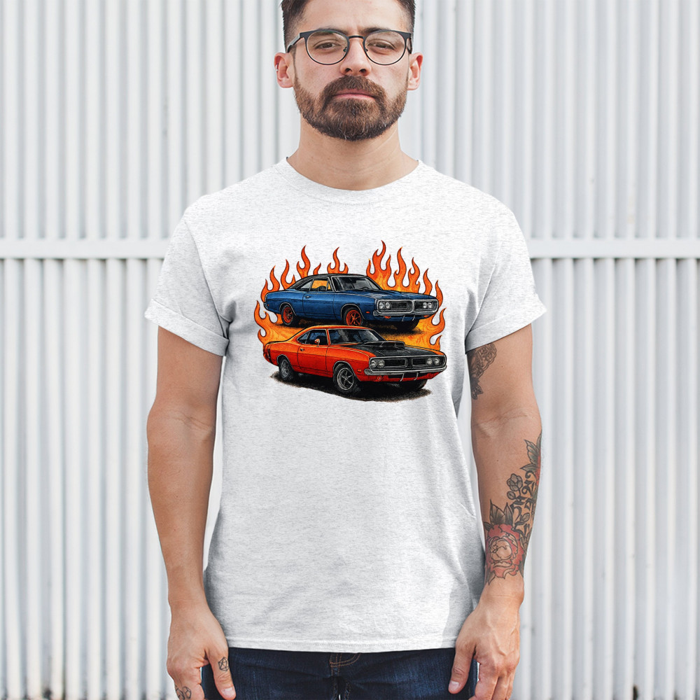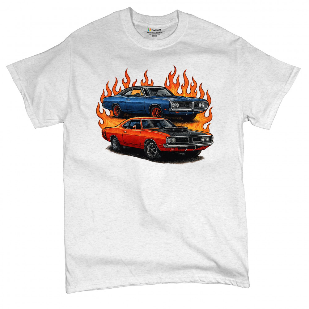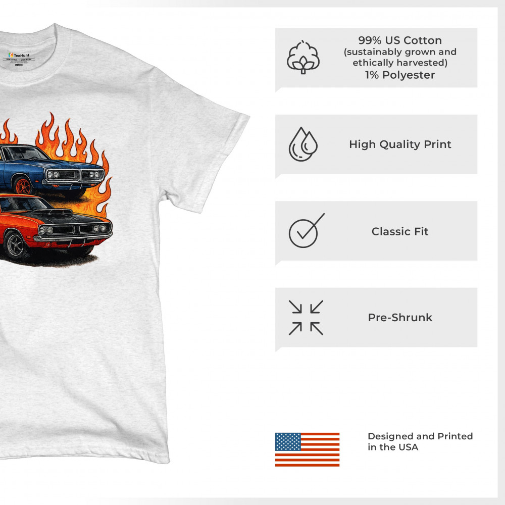 Bold flame design with classic muscle cars for gearheads and vintage horsepower lovers. Perfect for shows, cruise meets, and burnout nights.