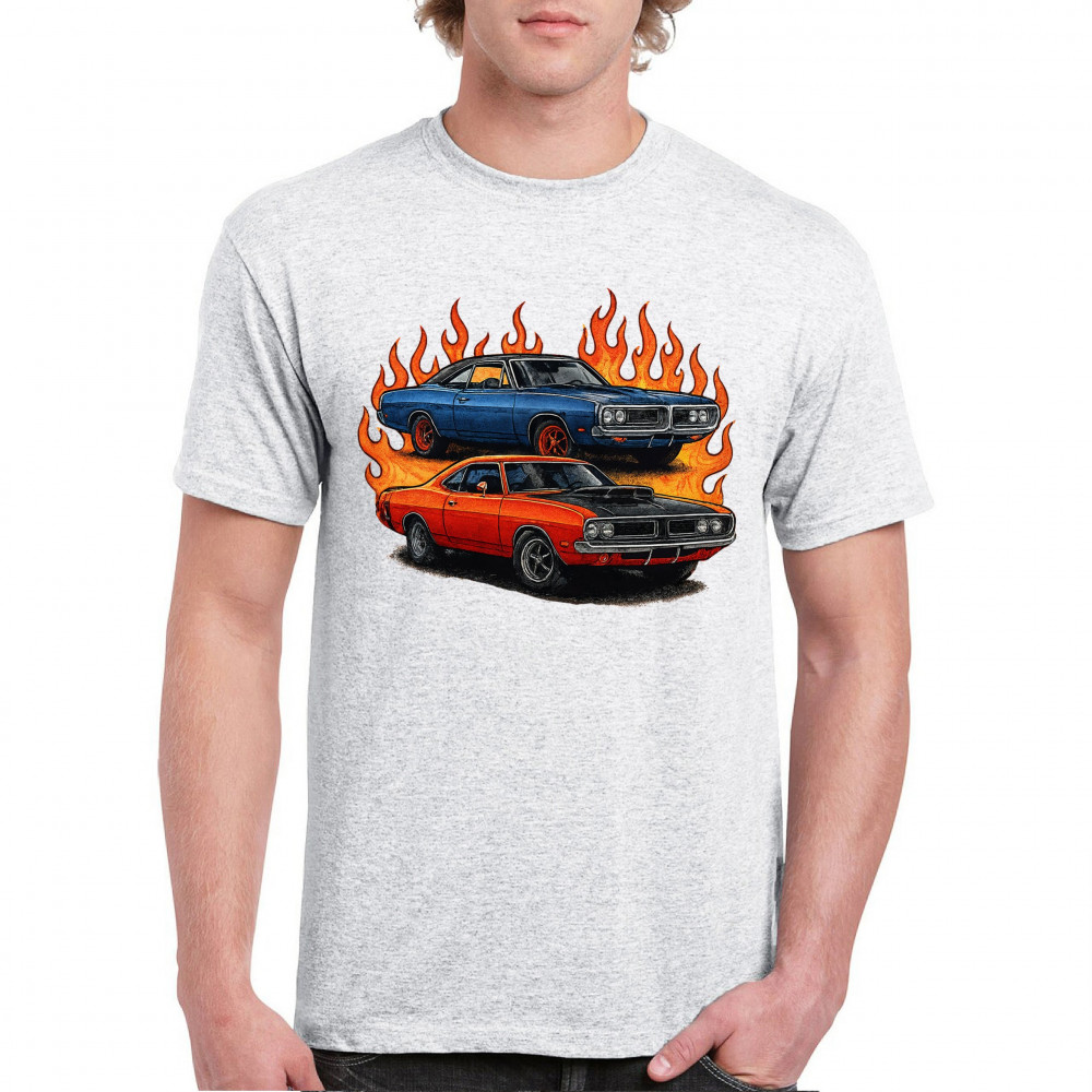 This flame-wrapped design showcases two classic muscle cars set ablaze with attitude, style, and vintage horsepower. Made for adrenaline seekers, rev heads, and car lovers who thrive on raw speed and retro fire. Whether at a burnout meet or a car show, this design lets your muscle car pride burn bright.
