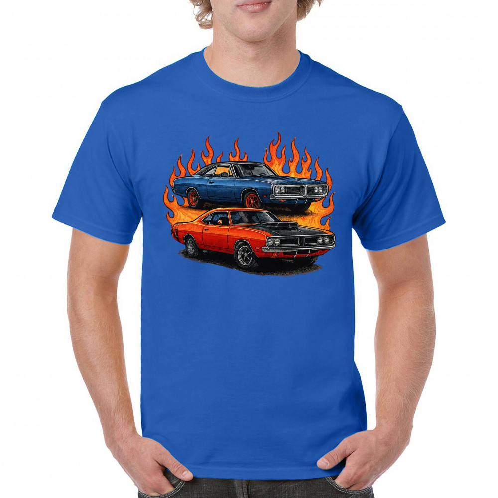Bold flame design with classic muscle cars for gearheads and vintage horsepower lovers. Perfect for shows, cruise meets, and burnout nights.