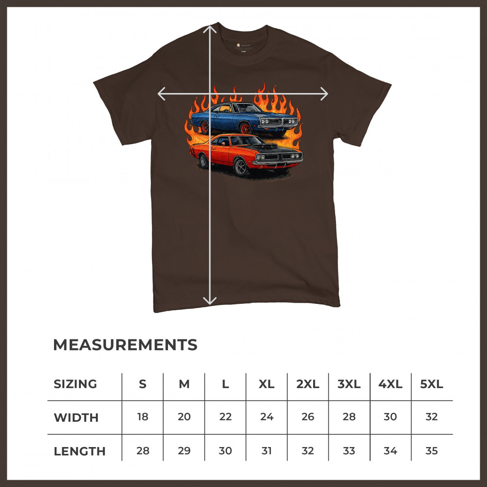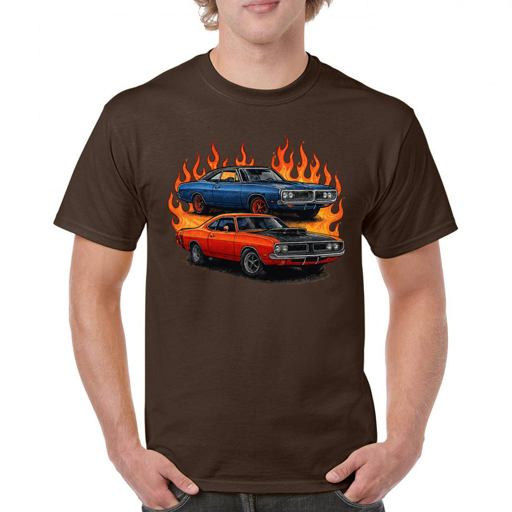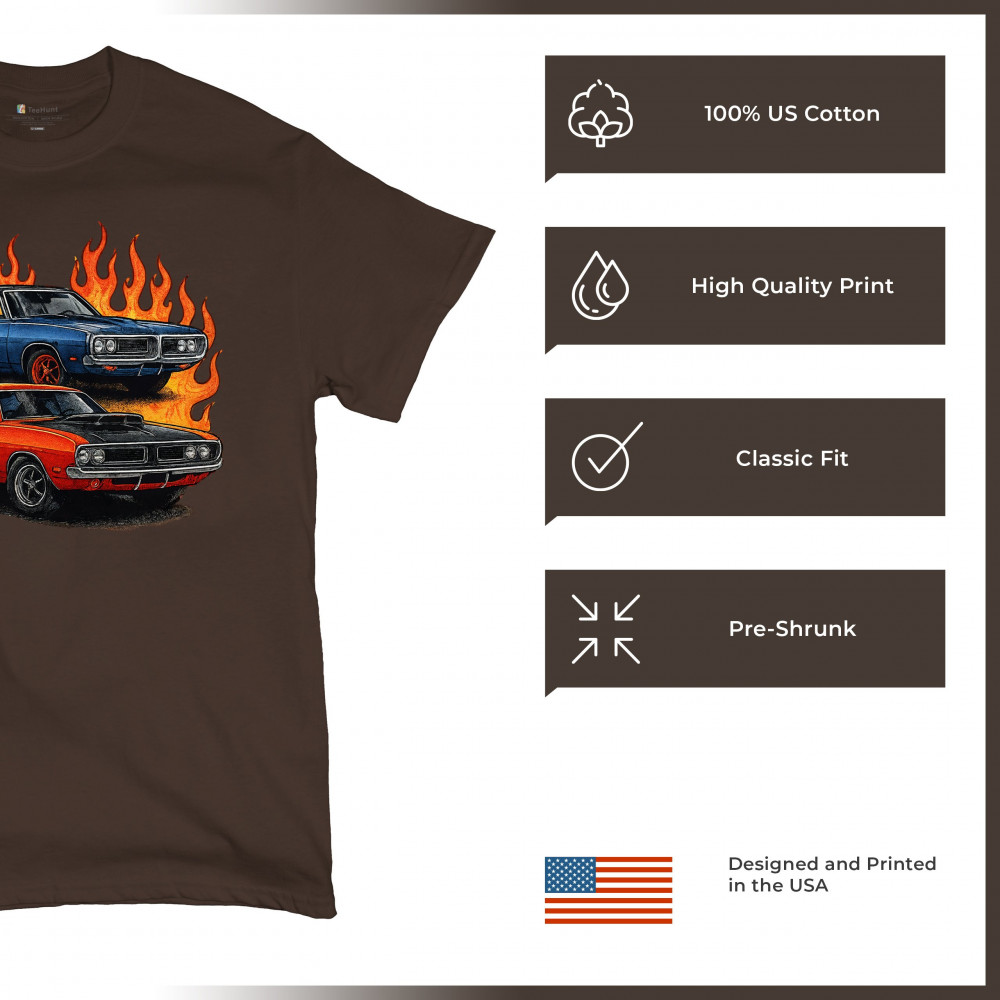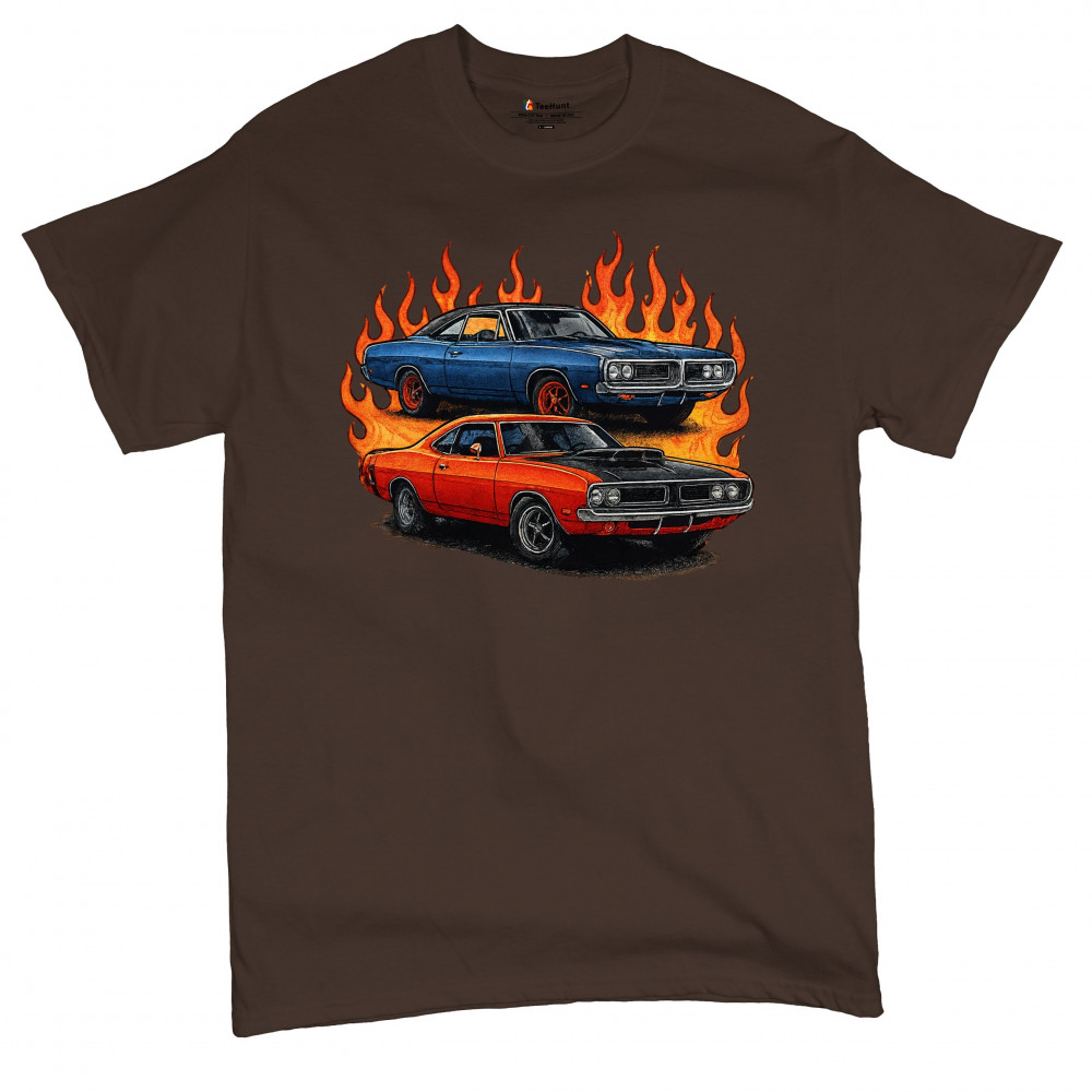 Bold flame design with classic muscle cars for gearheads and vintage horsepower lovers. Perfect for shows, cruise meets, and burnout nights.