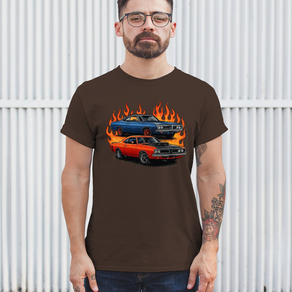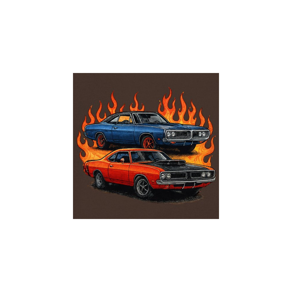 This flame-wrapped design showcases two classic muscle cars set ablaze with attitude, style, and vintage horsepower. Made for adrenaline seekers, rev heads, and car lovers who thrive on raw speed and retro fire. Whether at a burnout meet or a car show, this design lets your muscle car pride burn bright.