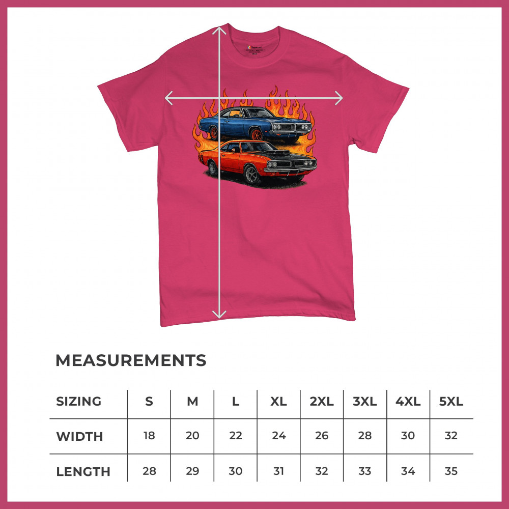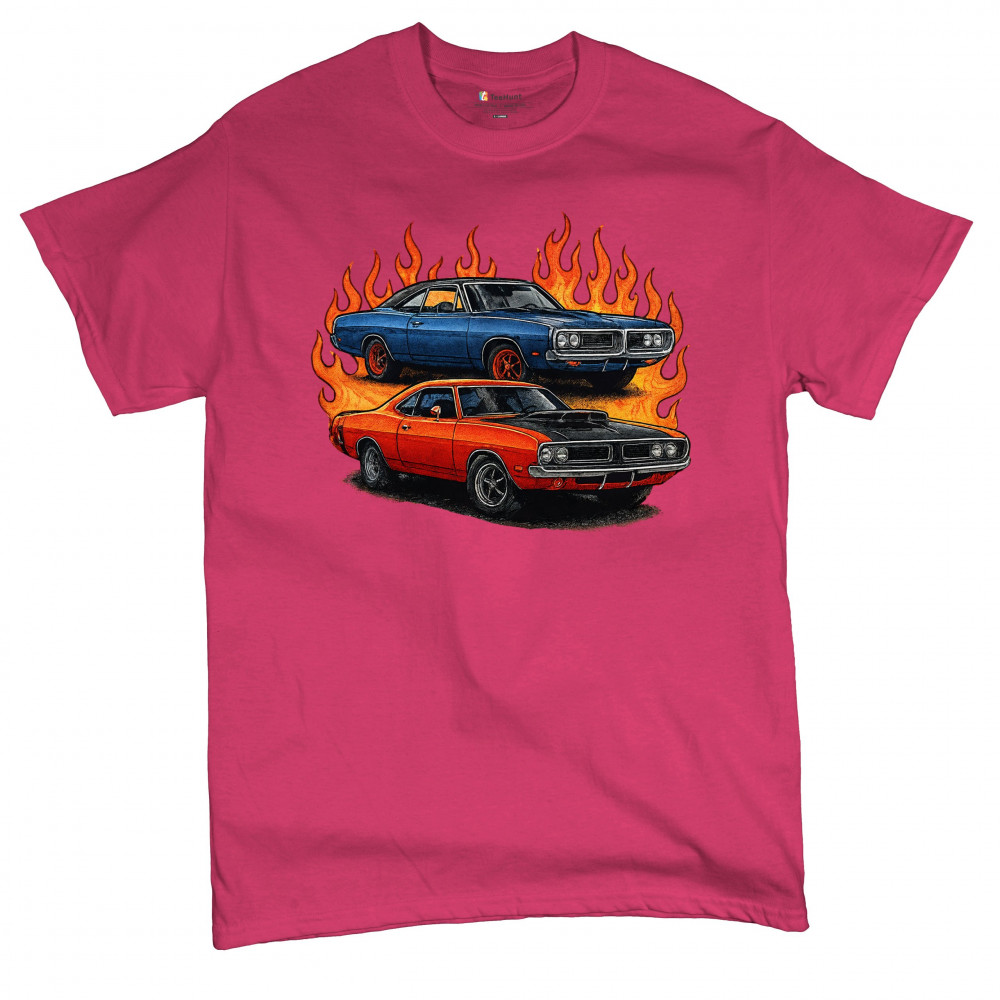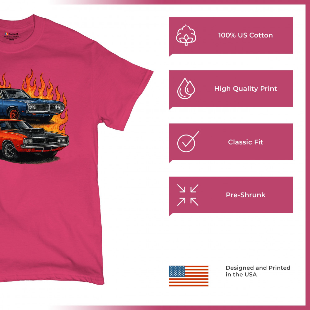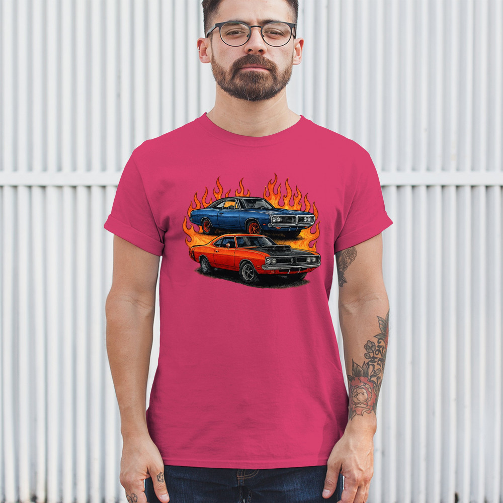 Bold flame design with classic muscle cars for gearheads and vintage horsepower lovers. Perfect for shows, cruise meets, and burnout nights.