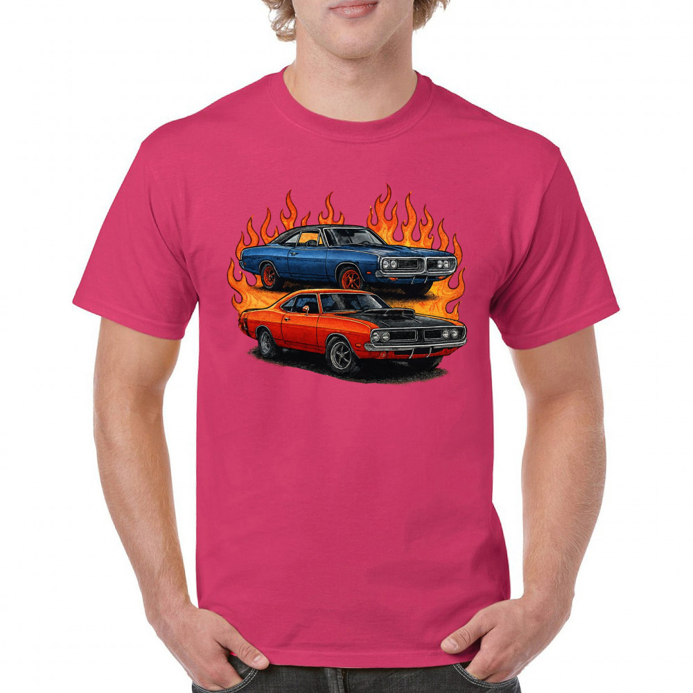 This flame-wrapped design showcases two classic muscle cars set ablaze with attitude, style, and vintage horsepower. Made for adrenaline seekers, rev heads, and car lovers who thrive on raw speed and retro fire. Whether at a burnout meet or a car show, this design lets your muscle car pride burn bright.
